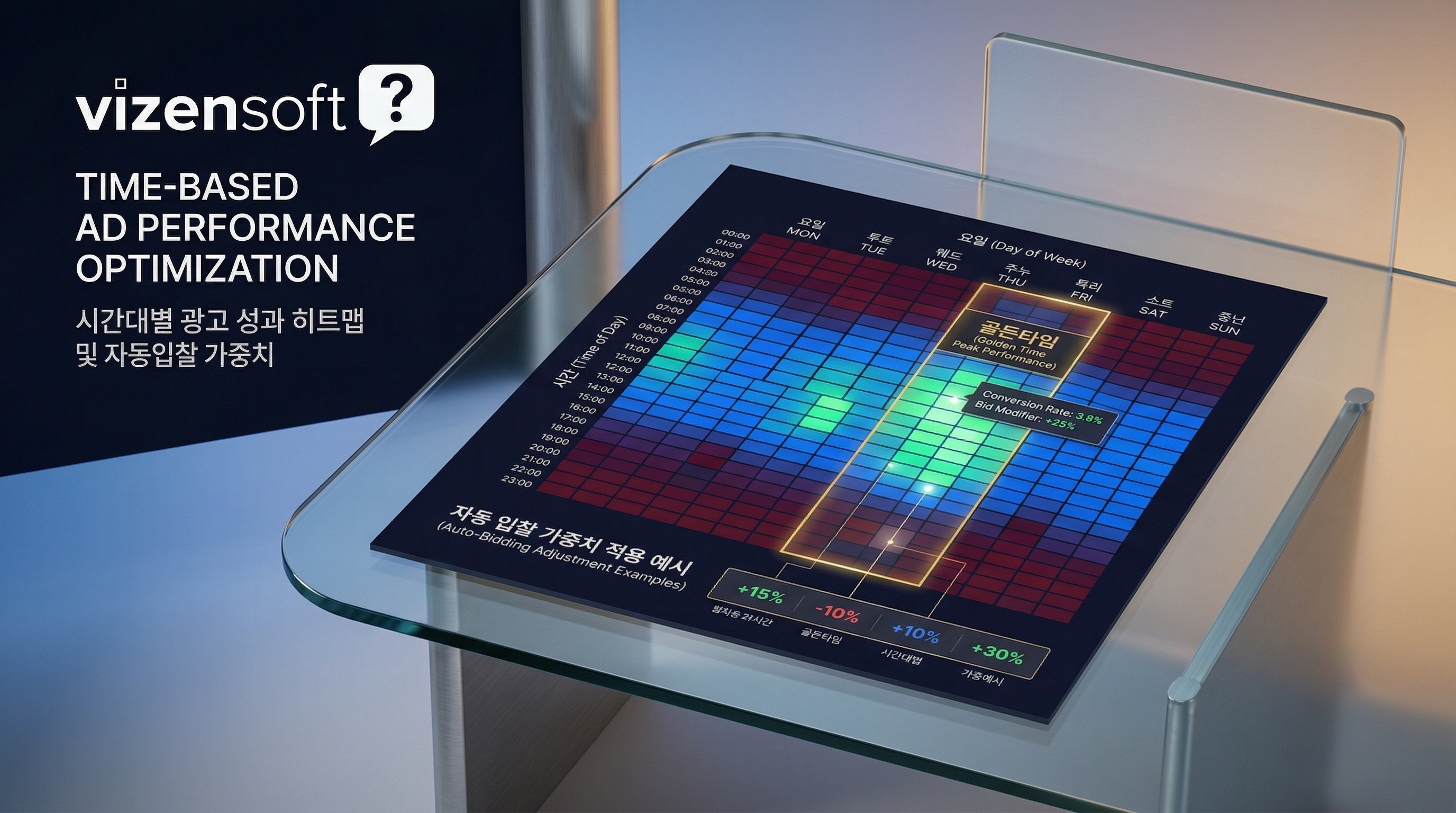 시간대별 최적화를 직접 구현하려면 먼저 최소 3개월 이상의 시간대별 성과 데이터를 수집해야 합니다. 네이버 광고 관리 시스템의 '시간대 보고서'를 통해 시간대별 클릭수, 전환수, 전환율을 확인하고, 성과가 집중되는 골든타임과 비효율 시간대를 명확히 구분하는 것이 선행되어야 합니다. 하지만 이 데이터를 보고서에서 수동으로 읽고 매일 입찰가에 반영하는 것은 현실적으로 매우 어렵습니다. 비젠소프트의 AI 자동입찰 시스템은 이 전 과정을 자동화하여, 마케터가 전략에만 집중할 수 있는 환경을 제공합니다.