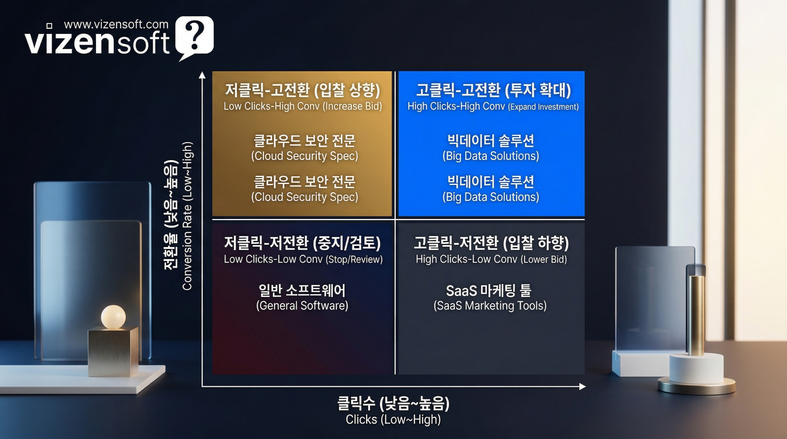 여기서 중요한 것이 하나 더 있습니다. 바로 랜딩페이지 품질과의 연계입니다. 아무리 좋은 자동입찰 전략을 적용해도, 사용자가 광고를 클릭한 후 도달하는 랜딩페이지가 불량하면 전환이 일어나지 않습니다. 비젠소프트는 AI 자동입찰 시스템과 함께 랜딩페이지 관리 시스템을 자체 보유하고 있어, 광고 클릭 후의 경험까지 종합적으로 최적화할 수 있습니다. 특정 키워드로 유입된 사용자에게 해당 키워드에 맞춤화된 랜딩페이지를 동적으로 제공하면, 전환율을 평균 35~50% 향상시킬 수 있다는 데이터가 있습니다.