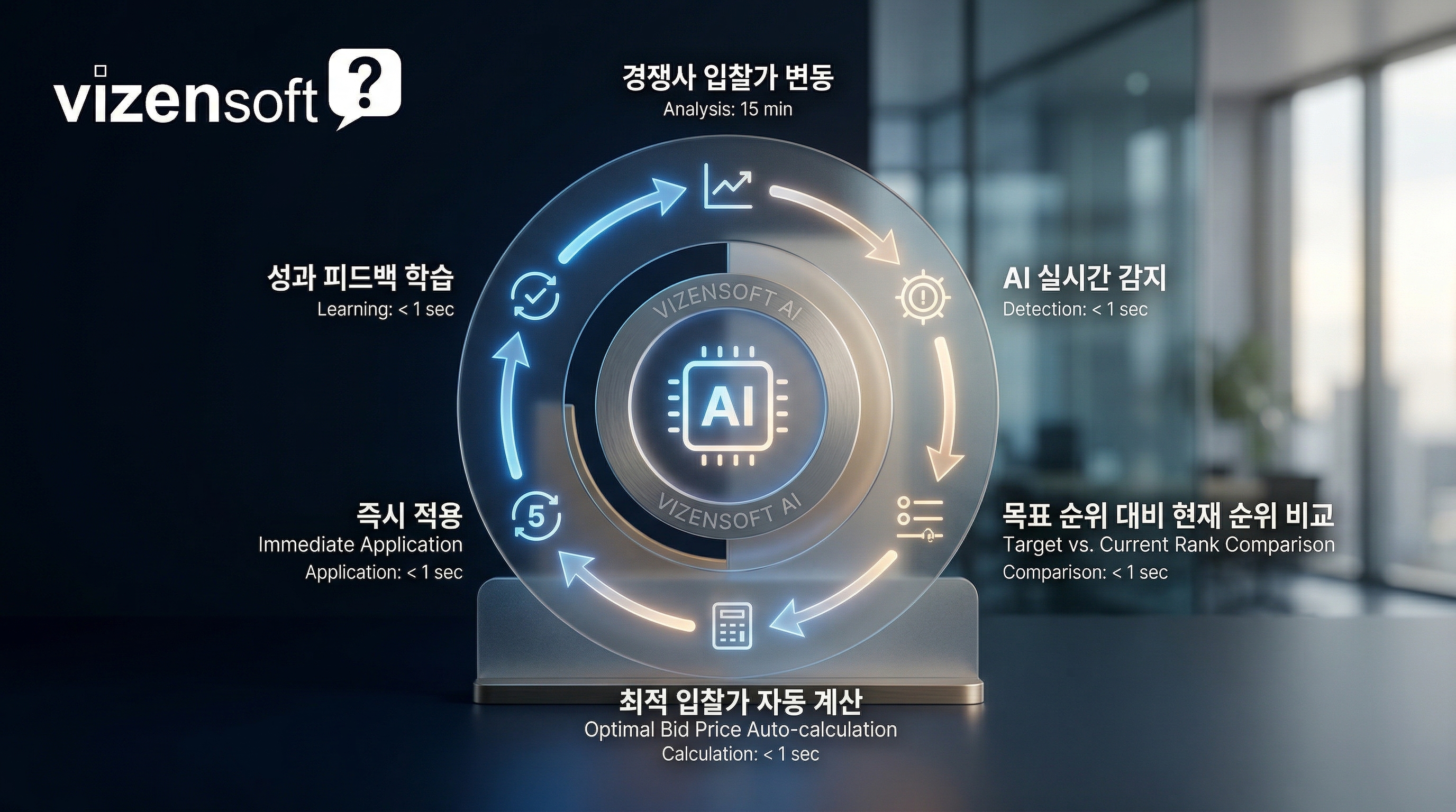 또한 전환 추적 시스템과의 연동이 핵심입니다. 비젠소프트는 AI 자동입찰 시스템과 함께 웹로그 솔루션 및 전환추적 시스템을 자체 보유하고 있어, 광고 클릭부터 실제 구매(또는 문의, 회원가입 등 목표 전환)까지의 전체 경로를 정밀하게 추적합니다. 이 데이터가 자동입찰 AI에 실시간으로 피드백되어, 지속적으로 입찰 전략이 고도화되는 선순환 구조가 만들어집니다. 단순히 네이버 광고 관리 시스템에서 제공하는 기본 전환 데이터만으로는 이런 정밀한 최적화가 어렵습니다.