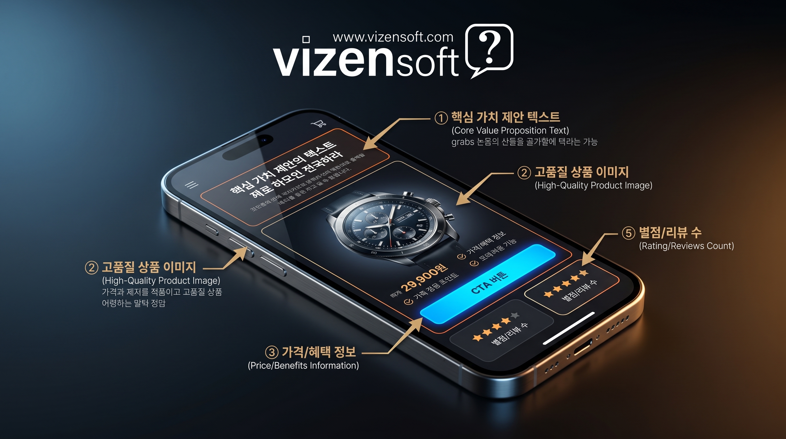 ① 핵심 가치 제안(Value Proposition)의 명확한 전달 — 상품명만 적지 말고, "이 상품이 고객의 어떤 문제를 해결하는가"를 1~2줄로 압축해서 상단에 배치해야 합니다. 예를 들어 "무릎 보호대"라는 상품명보다 "무릎 통증 없이 다시 뛰게 해주는 의료용 보호대"처럼 혜택을 전면에 내세우는 방식이 클릭을 유도합니다.