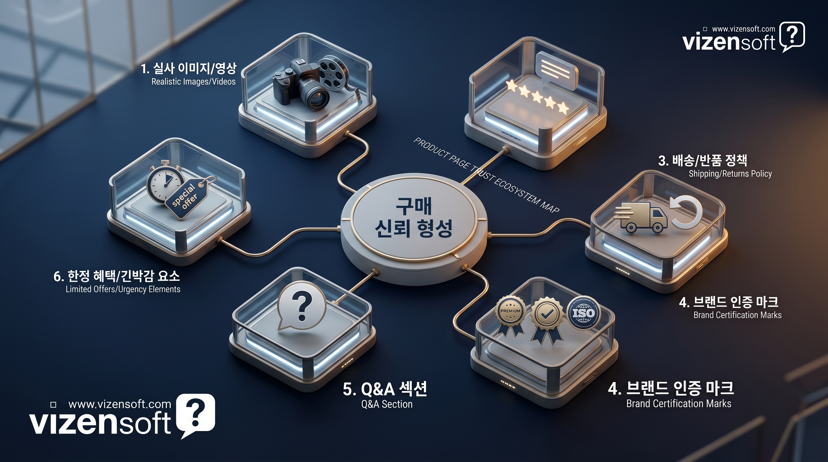 방문자가 상품 이미지와 가격을 확인하고도 구매를 망설이는 이유는 하나입니다. 신뢰가 부족하기 때문입니다. 오프라인 매장에서는 직원과 대화하고, 실물을 만져보고, 브랜드 매장의 분위기를 통해 신뢰를 형성합니다. 온라인 쇼핑에서는 이 모든 신뢰 신호를 상세페이지 안에 담아야 합니다.