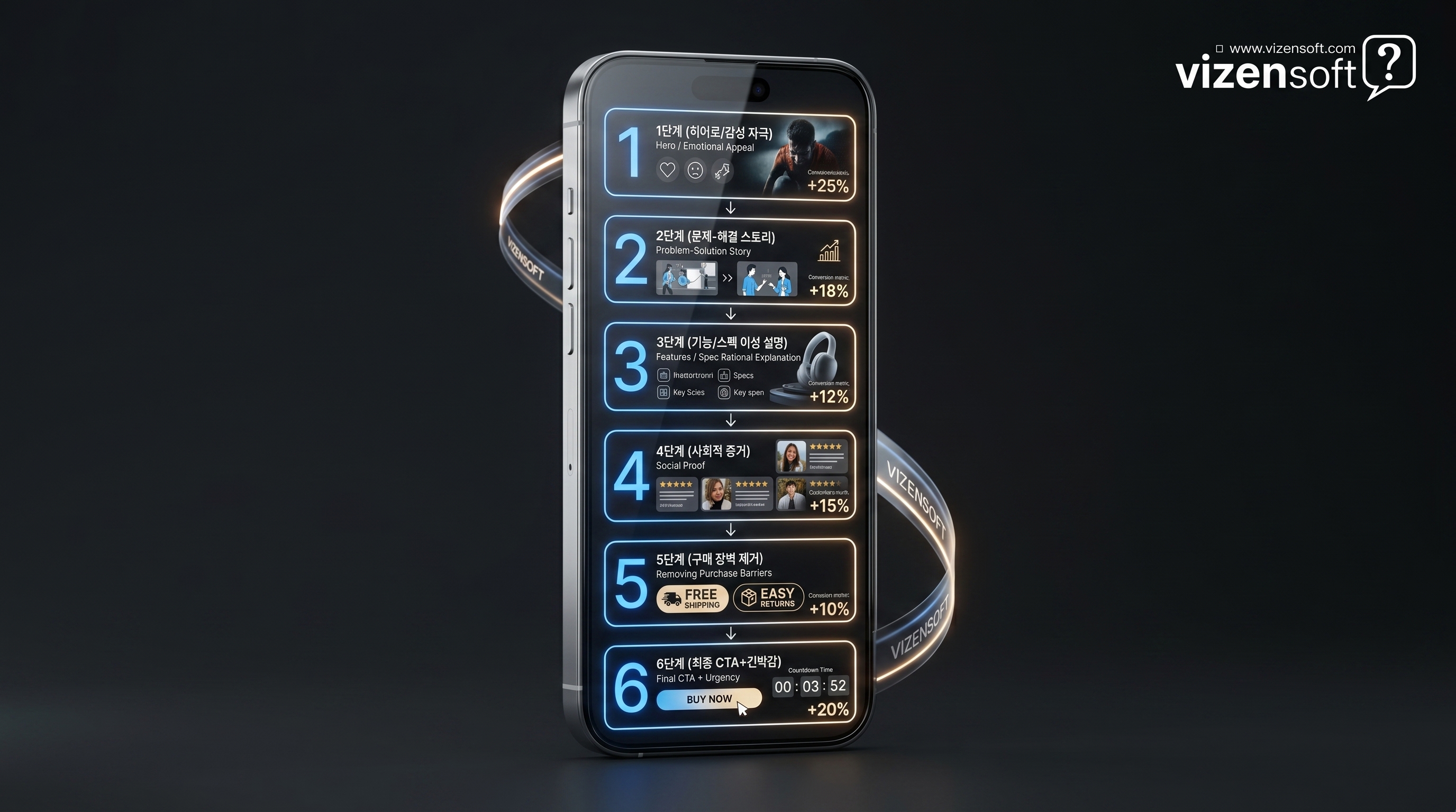 6단계 — 최종 CTA와 긴박감 요소: "오늘만 할인", "재고 OO개 남음", "내일까지 주문 시 익일 배송" 등으로 즉각적인 행동을 유도합니다.