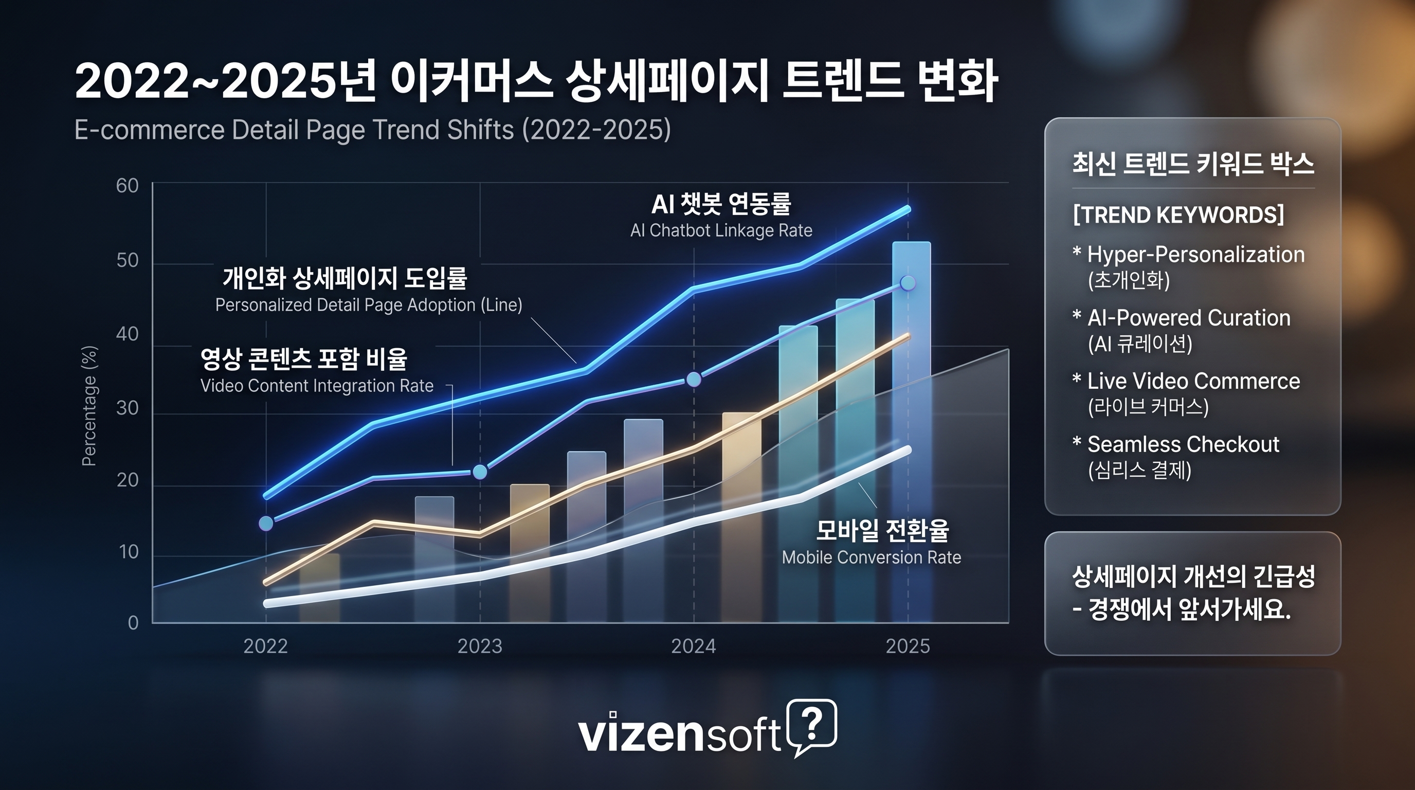 상품 상세페이지 설계의 트렌드는 빠르게 변화하고 있습니다. 특히 AI 기술의 이커머스 접목이 가속화되면서, 과거에는 대형 플랫폼만 가능했던 기능들이 중소형 쇼핑몰에도 도입되기 시작했습니다.