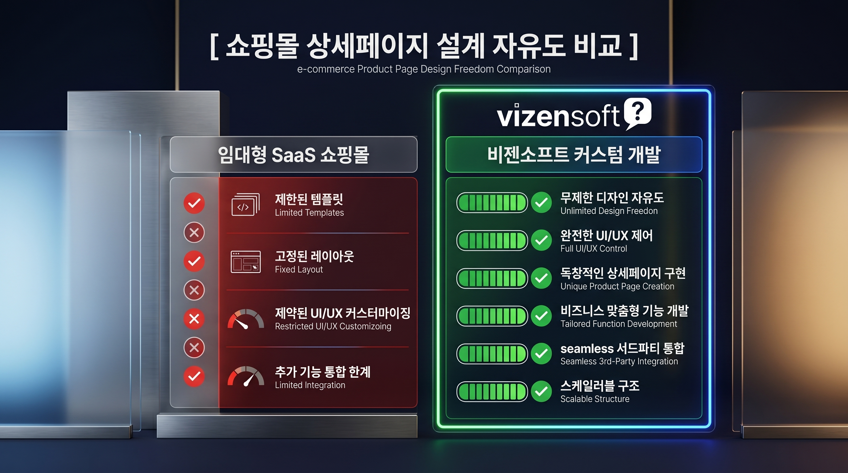 많은 쇼핑몰 운영자들이 처음 시작할 때 임대형(SaaS) 솔루션을 선택합니다. 초기 비용이 낮고 구축이 빠르다는 장점이 있기 때문입니다. 하지만 쇼핑몰이 성장하고 상세페이지 최적화가 필요해지는 시점부터 임대형 솔루션의 한계가 본격적으로 드러나기 시작합니다.