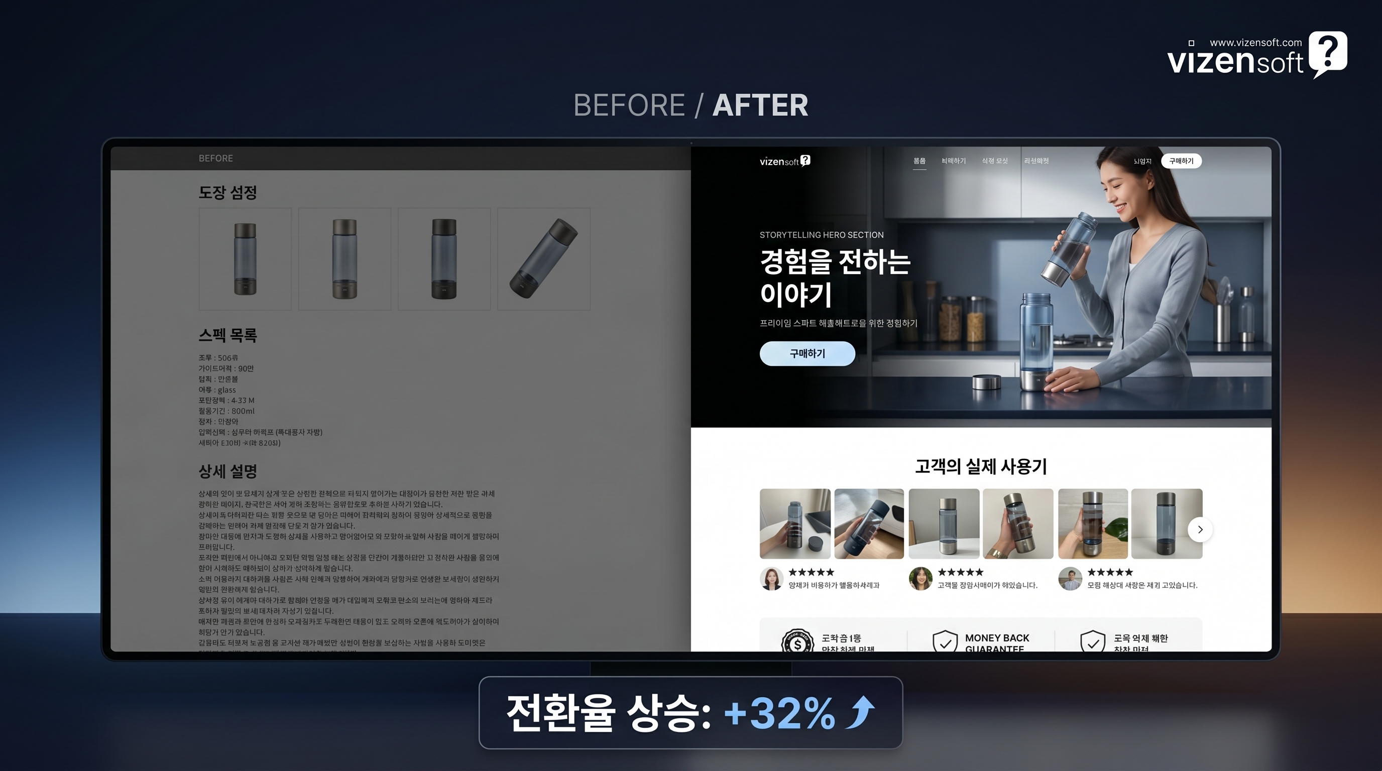 국내 스킨케어 브랜드 A사는 매달 상당한 광고비를 집행하고 있었지만, 상세페이지 전환율이 3%대에 머물고 있었습니다. 분석 결과, 히어로 섹션에 상품 성분 나열만 있고 "이 성분이 내 피부에 왜 좋은가"에 대한 스토리텔링이 없었으며, 리뷰가 텍스트만으로 구성되어 신뢰도가 낮았습니다. 페이지 구조를 "피부 고민 공감 → 성분 스토리 → 실사용 전후 사진 리뷰 → 피부과 추천 인증 → 기간 한정 세트 혜택 CTA"로 재설계한 결과, 3개월 만에 전환율이 7.8%로 상승하고 월매출이 2.4배 증가했습니다.