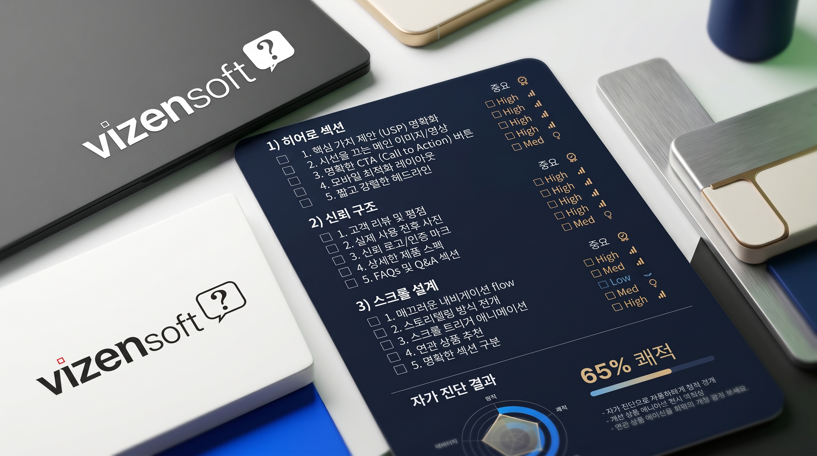 상세페이지 설계 개선을 어디서부터 시작해야 할지 막막하다면, 아래 체크리스트를 기준으로 현재 페이지를 점검해 보세요. 체크하지 못한 항목이 많을수록 개선 여지가 크다는 뜻입니다.