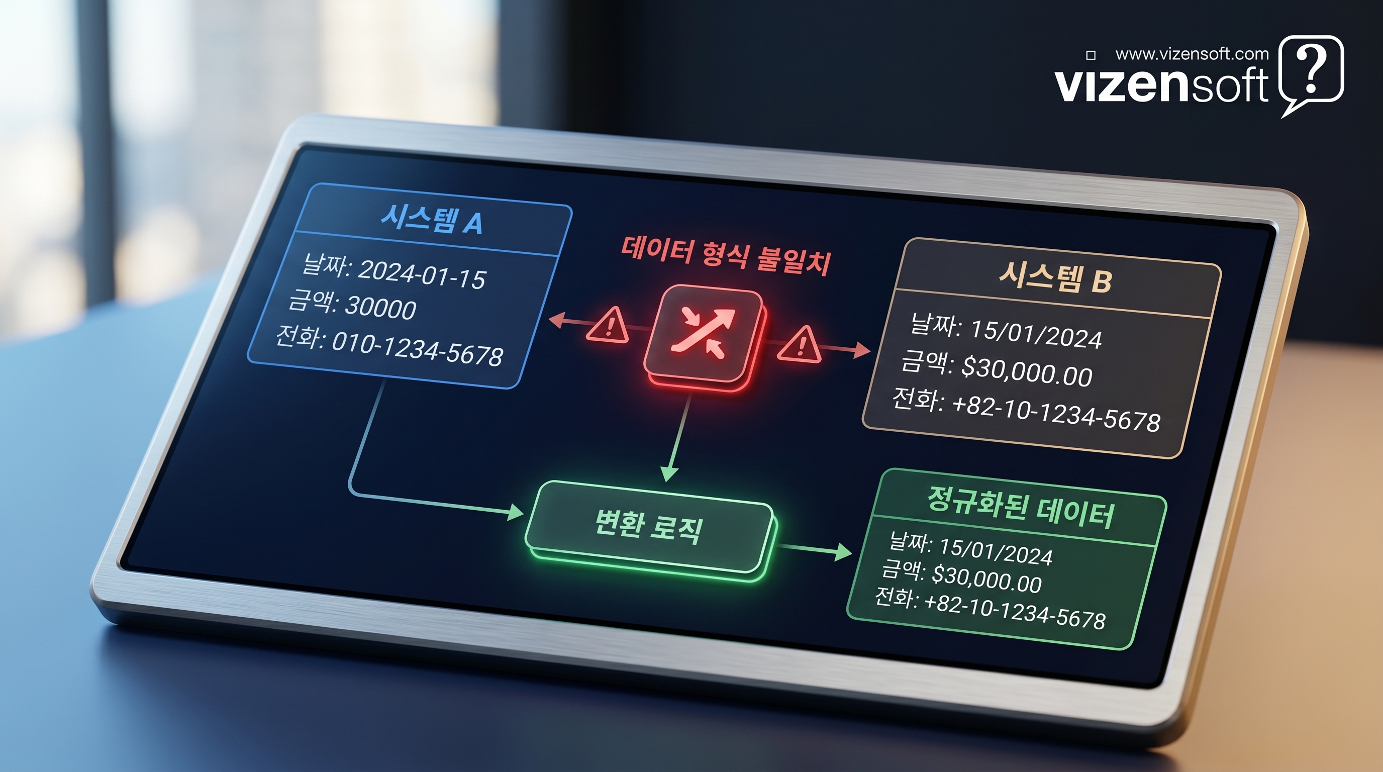 예를 들어 A시스템은 날짜를 "2024-01-15" 형식으로 저장하는데, B시스템은 "15/01/2024"로 처리하고, C시스템은 Unix 타임스탬프(1705276800)로 관리합니다. 이 세 시스템을 연동하면 어떻게 될까요? 날짜 하나만 해도 세 가지 변환 로직이 필요합니다. 여기에 금액, 주소, 전화번호, 제품 코드까지 추가되면 변환 로직의 복잡도는 기하급수적으로 증가합니다.