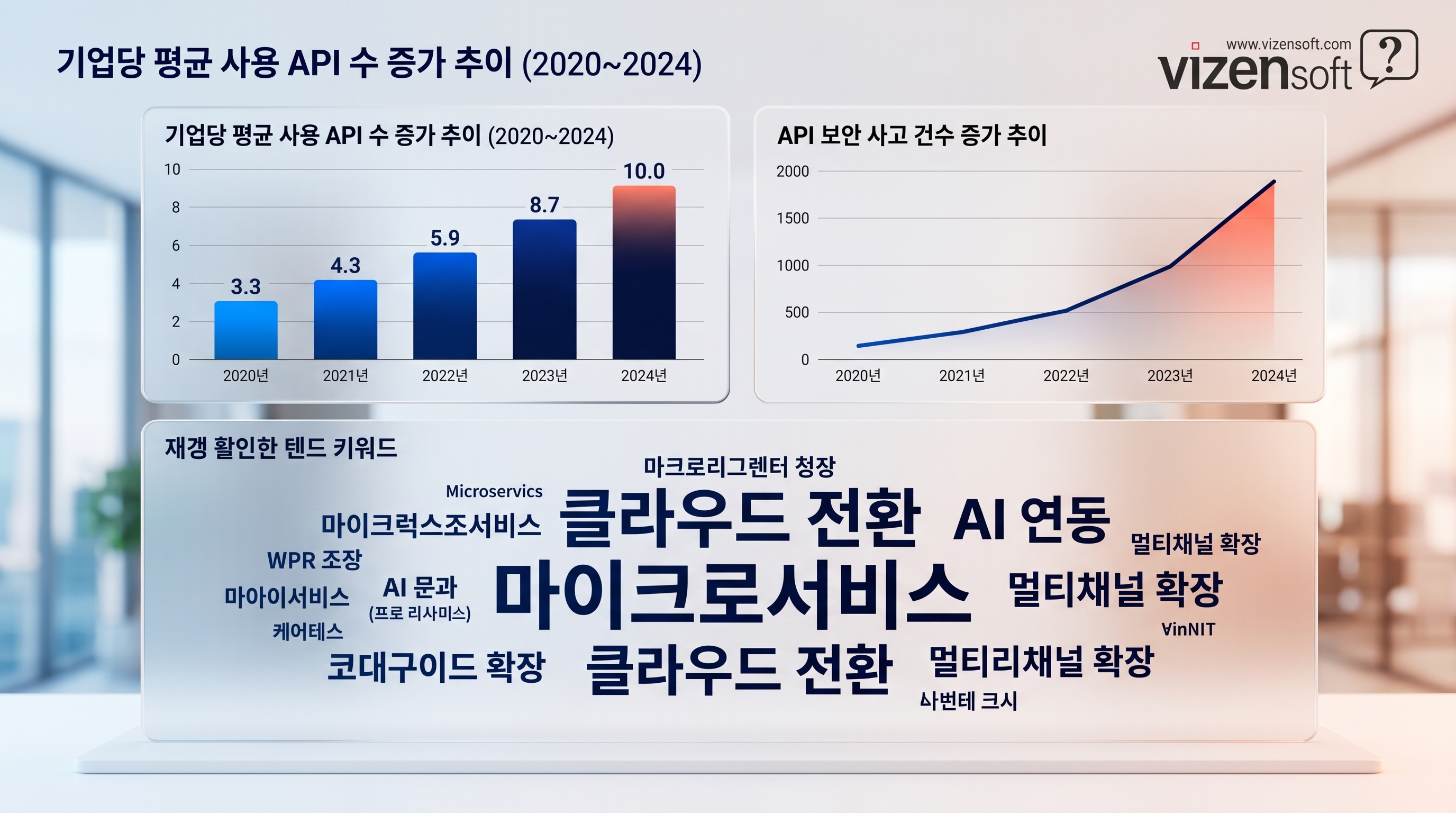 글로벌 조사 기관인 포스터 앤 설리번(Frost & Sullivan)의 분석에 따르면, 기업들이 사용하는 외부 API의 수는 2020년 대비 2024년에 평균 3배 이상 증가했으며, 이 추세는 계속 가속화될 것으로 전망됩니다. 더불어, API 보안 사고 건수도 같은 기간 2.5배 증가했는데, 이는 연동 API 수의 증가가 보안 관리 부담을 그대로 끌어올리고 있음을 보여줍니다.