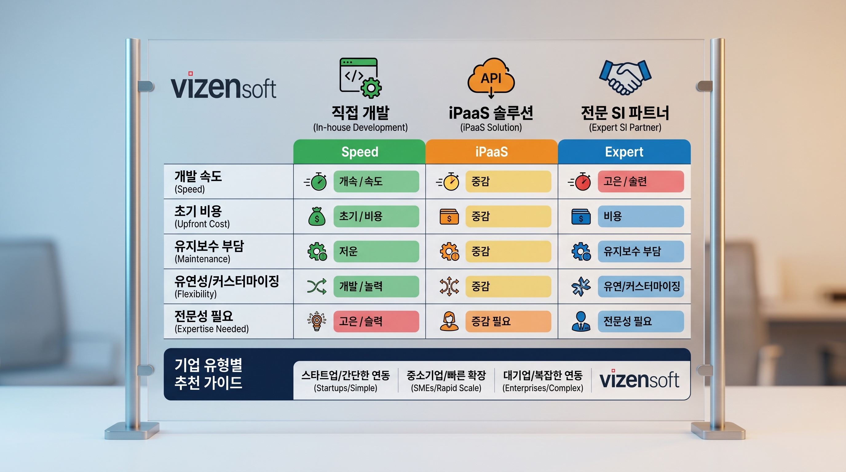 | 구분 | 직접 개발 (In-house) | iPaaS 솔루션 활용 | 전문 SI 파트너 활용 |