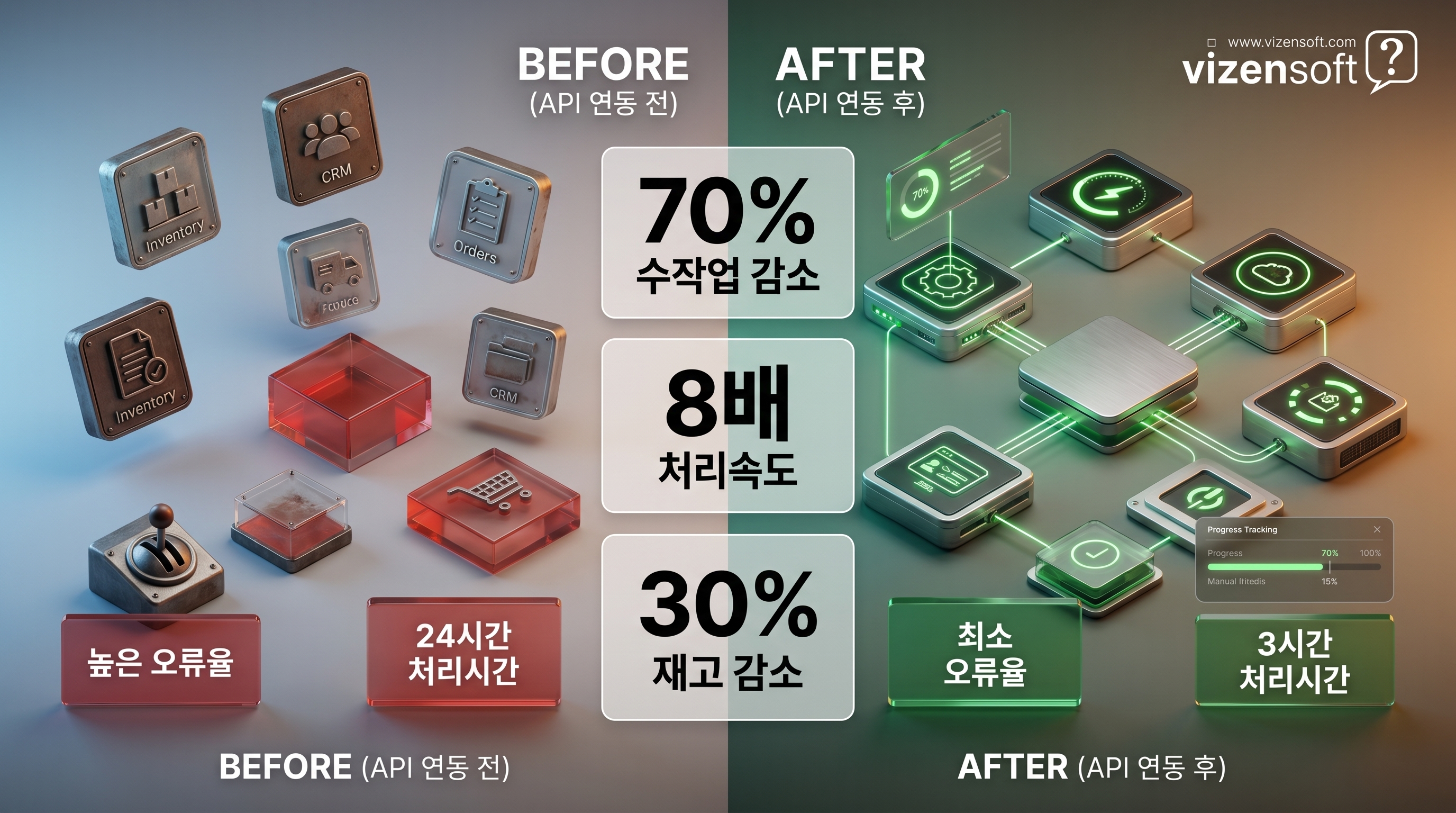 API 연동을 통해 4개 시스템을 완전히 통합한 결과, 수작업 데이터 입력 업무가 70% 감소했습니다. 주문 접수부터 배송 완료까지의 처리 사이클이 기존 평균 24시간에서 3시간으로 8배 단축되었고, 출고 오류는 월 15건에서 1~2건 수준으로 대폭 감소했습니다. 연간 절감 비용을 계산해보니 인건비와 오류 처리 비용을 합산해 약 1억 2천만 원 수준이었습니다.