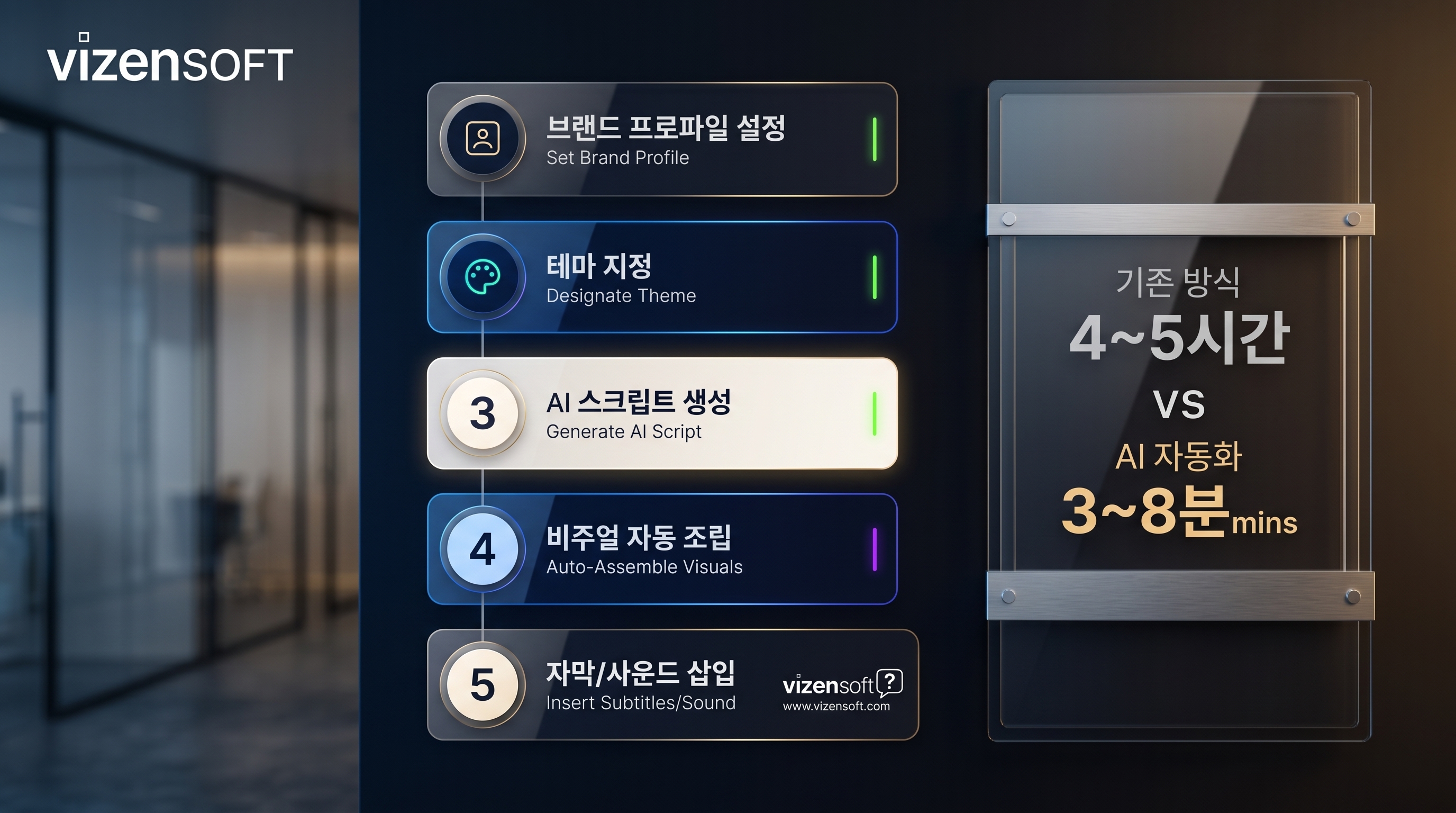 Step 4. 비주얼 자동 조립 — 스크립트에 맞는 배경 영상, 이미지, 모션 그래픽을 AI가 자동으로 선택하고 조합합니다. 기업이 보유한 자체 영상 라이브러리를 연동하면 브랜드 일관성도 유지됩니다.