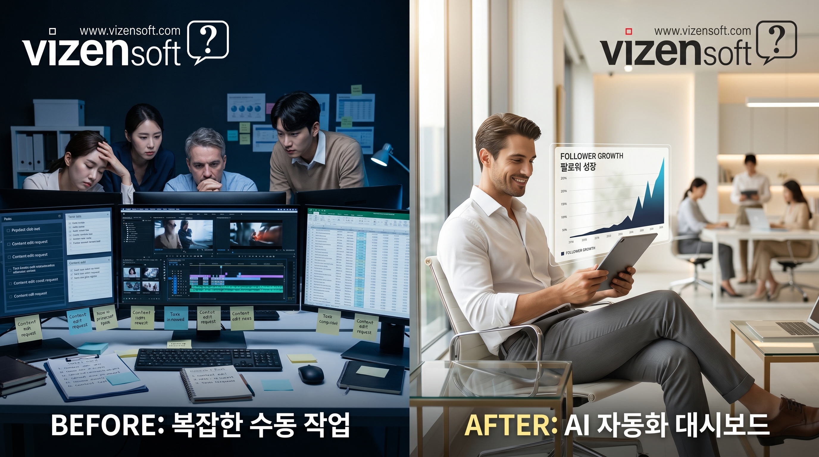 | 콘텐츠 제작 | 전원 직접 촬영·편집 | 직접 제작 후 예약만 자동화 | 기획·제작·편집 모두 AI 자동화 |