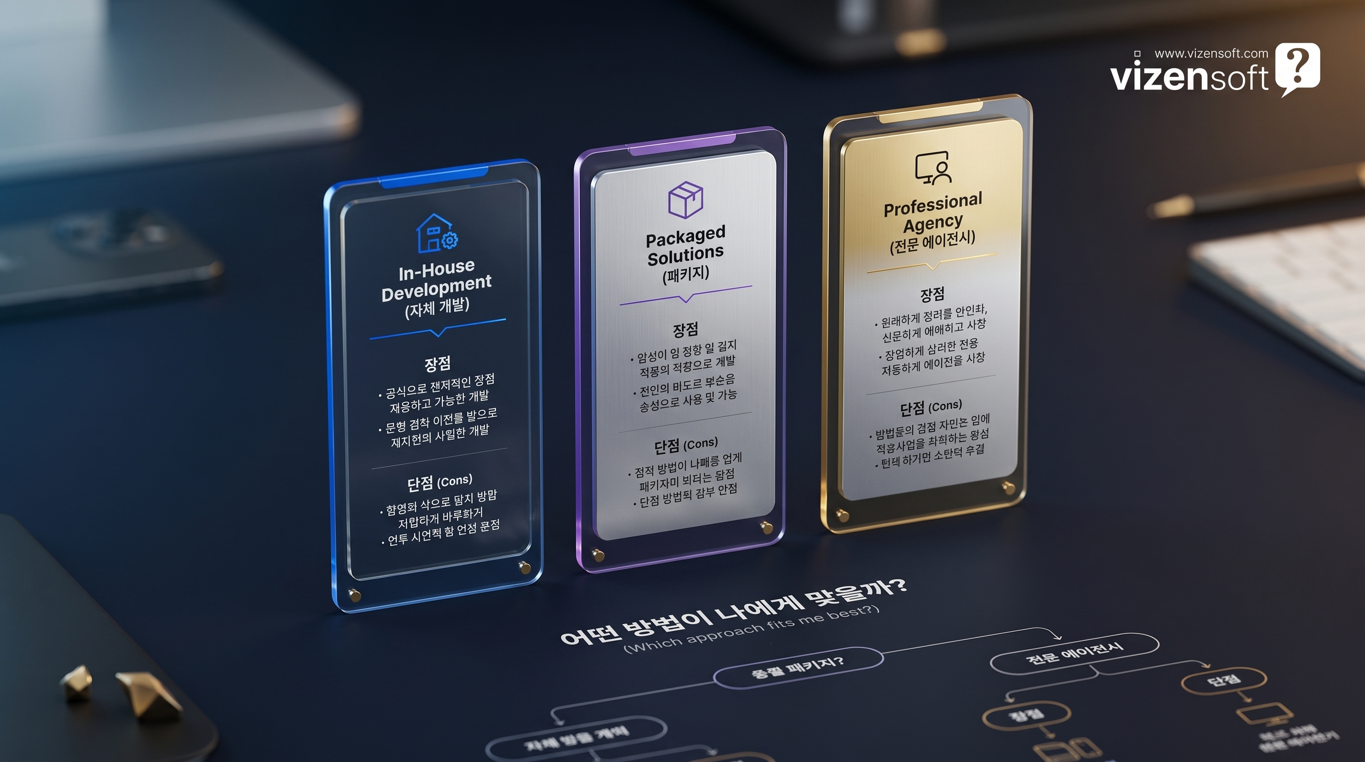| 구분 | 자체 개발 (인하우스) | 패키지/템플릿 활용 | 전문 UX 에이전시 의뢰 |