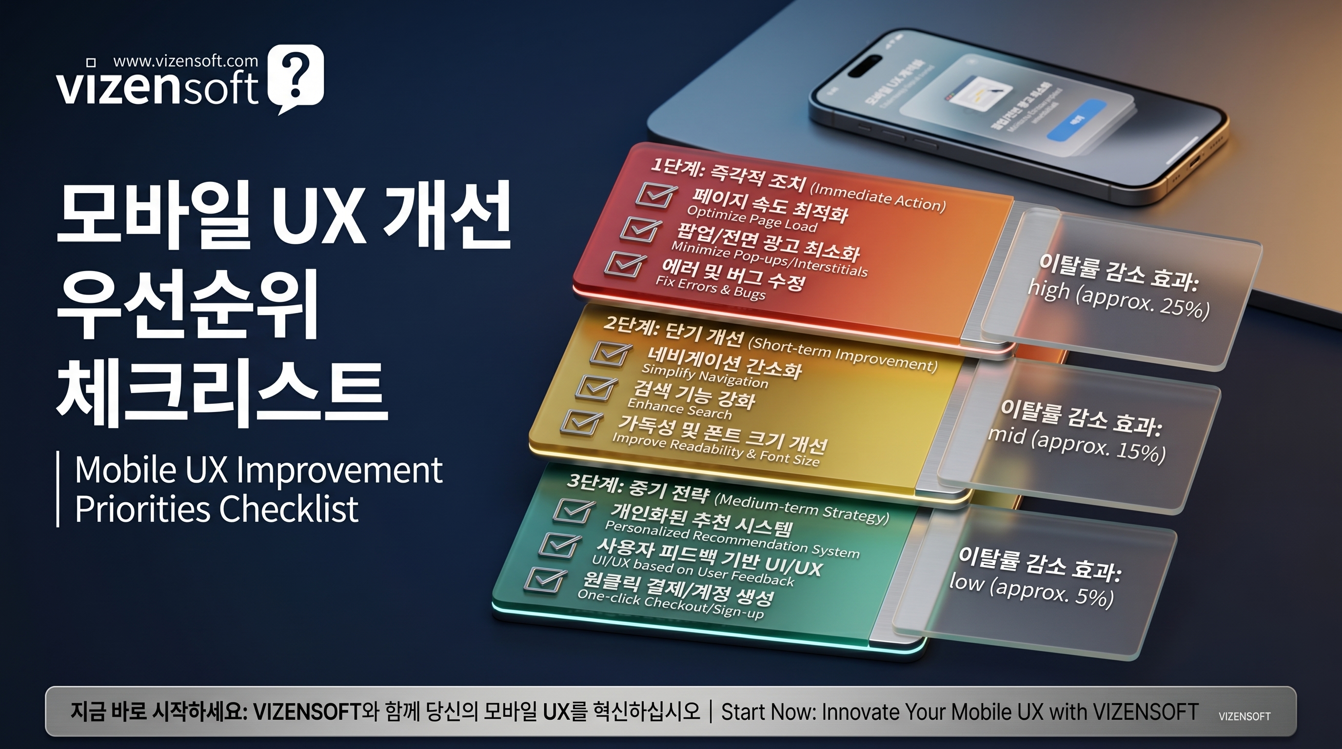 모바일 UX 개선은 한 번에 모든 것을 바꾸려 하면 실패하기 쉽습니다. 데이터에 기반해 우선순위를 정하고, 단계적으로 개선해나가는 것이 핵심입니다. 아래 체크리스트를 활용해 지금 당장 점검해보세요.