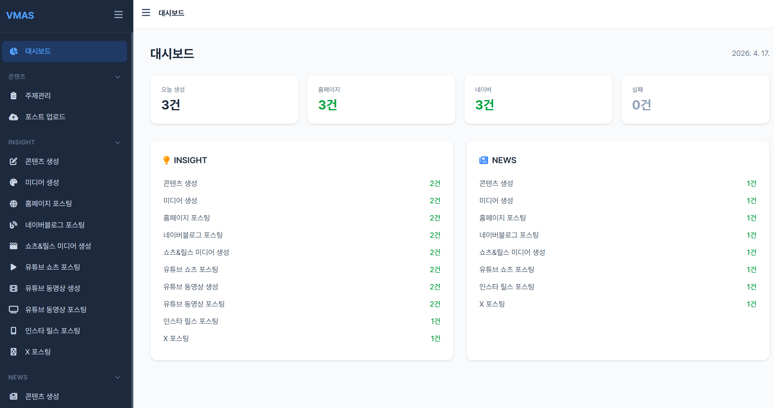 VMAS는 "AI 글쓰기"를 넘어 "생산 → 포맷 변환 → 다채널 배포 → 모니터링"까지 전 과정을 자동화한 국내 유일의 통합 솔루션입니다. docx 파일 하나 올리고 나면, 그 다음은 VMAS가 알아서 5개 채널에 올려줍니다.