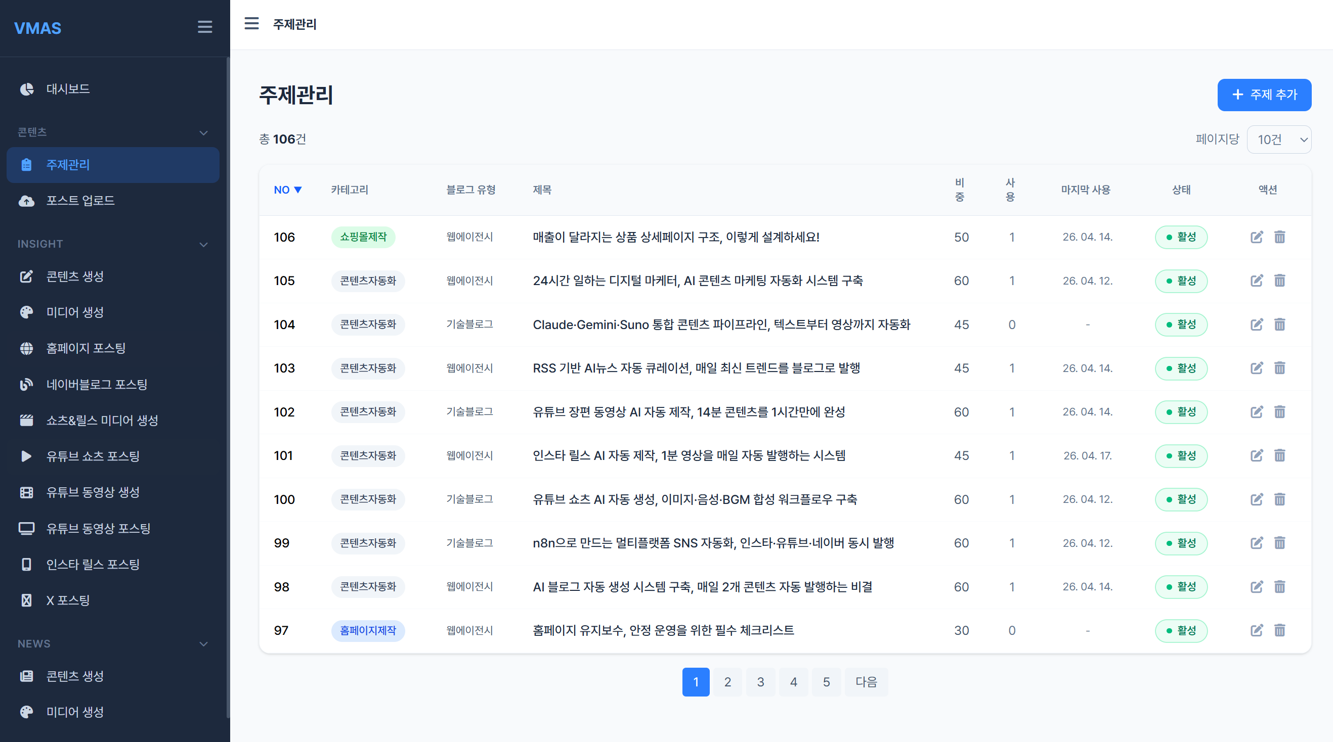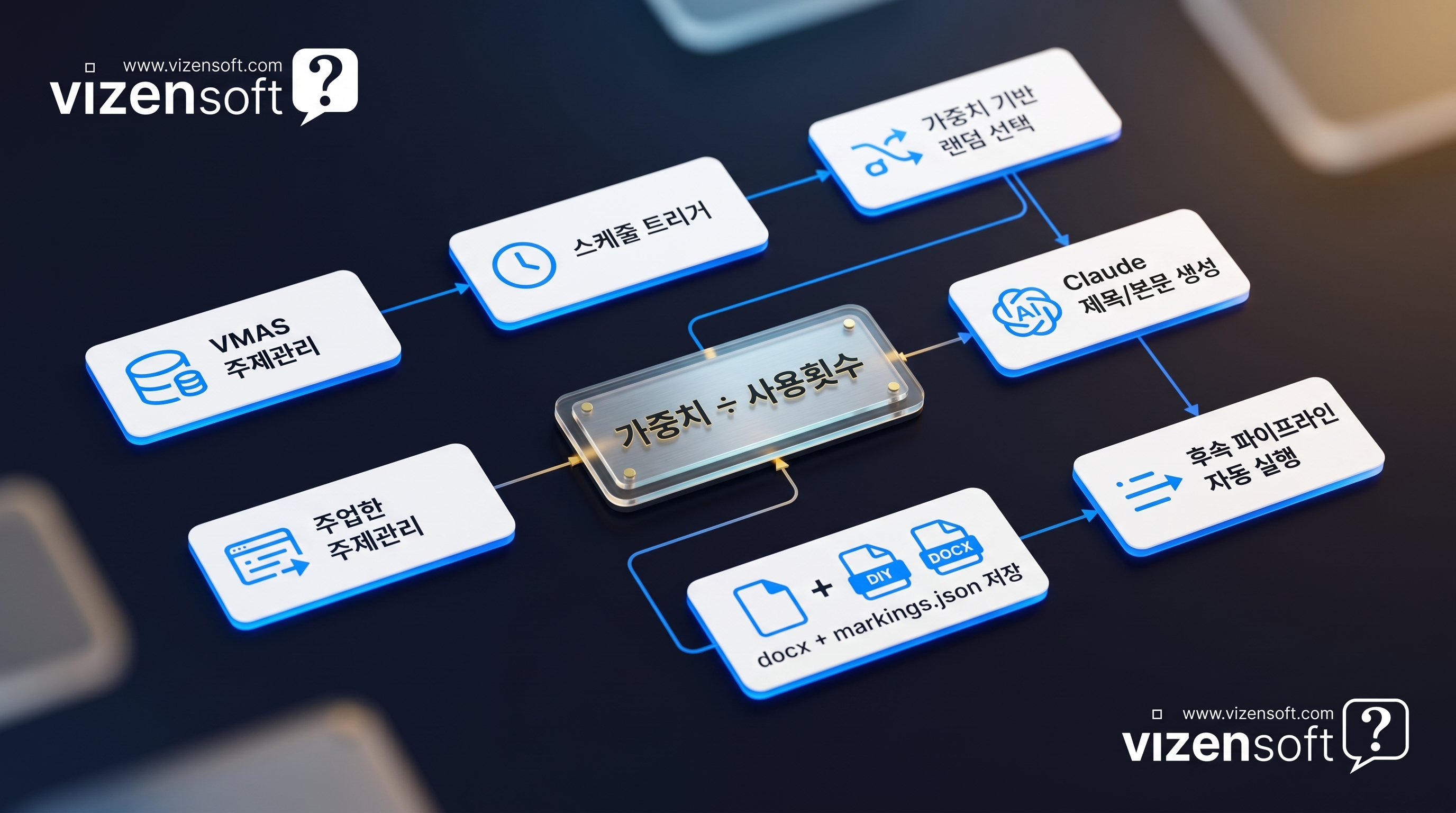 VMAS의 자동 콘텐츠 생성은 주제 관리 시스템을 기반으로 동작합니다. 운영자는 미리 수십 개의 주제(제목 초안·키워드·카테고리·가중치·메모)를 등록해두기만 하면, 매일 정해진 시간에 시스템이 가중치 기반으로 랜덤 선택해서 그날의 포스트를 만듭니다.