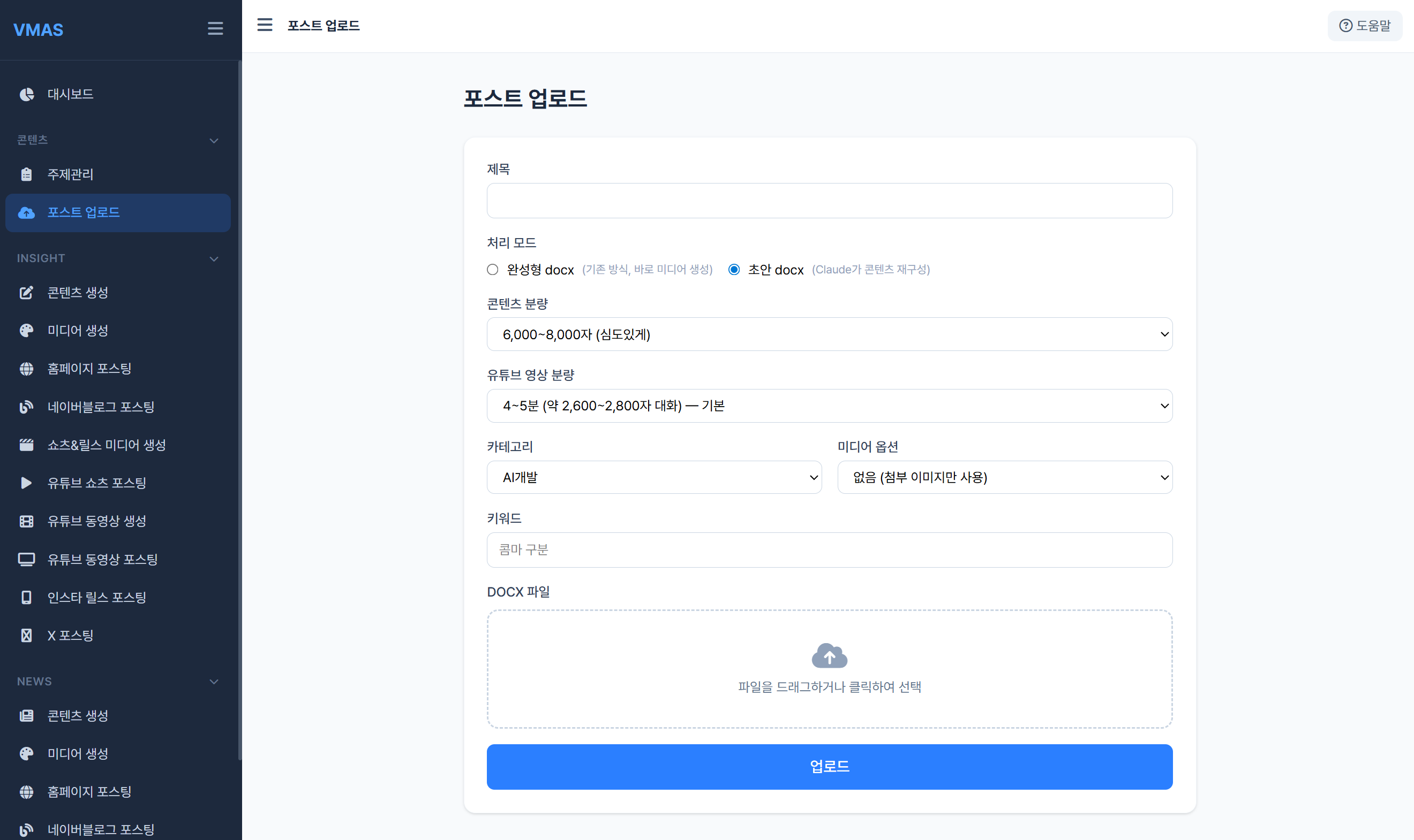 ▲ 포스트 업로드 화면 — 제목, 처리 모드, 분량, 카테고리, 미디어 옵션, docx 파일