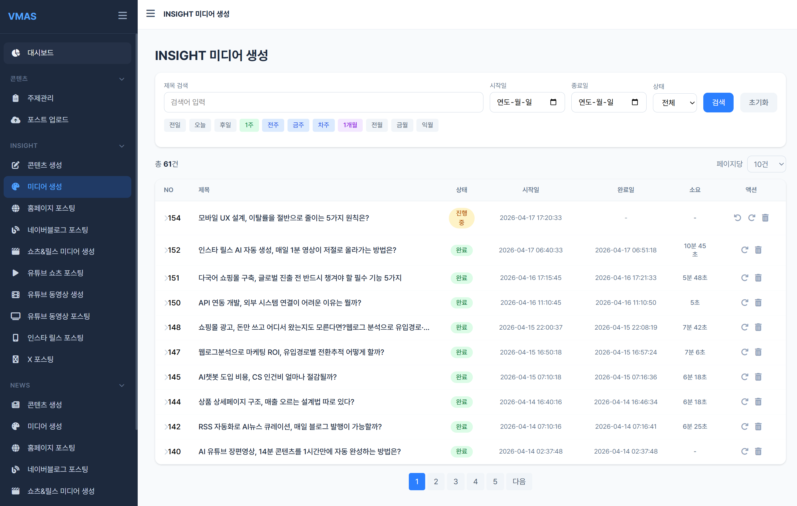 ▲ INSIGHT 미디어 생성 목록 — 생성 시작일, 완료일, 소요시간을 확인
