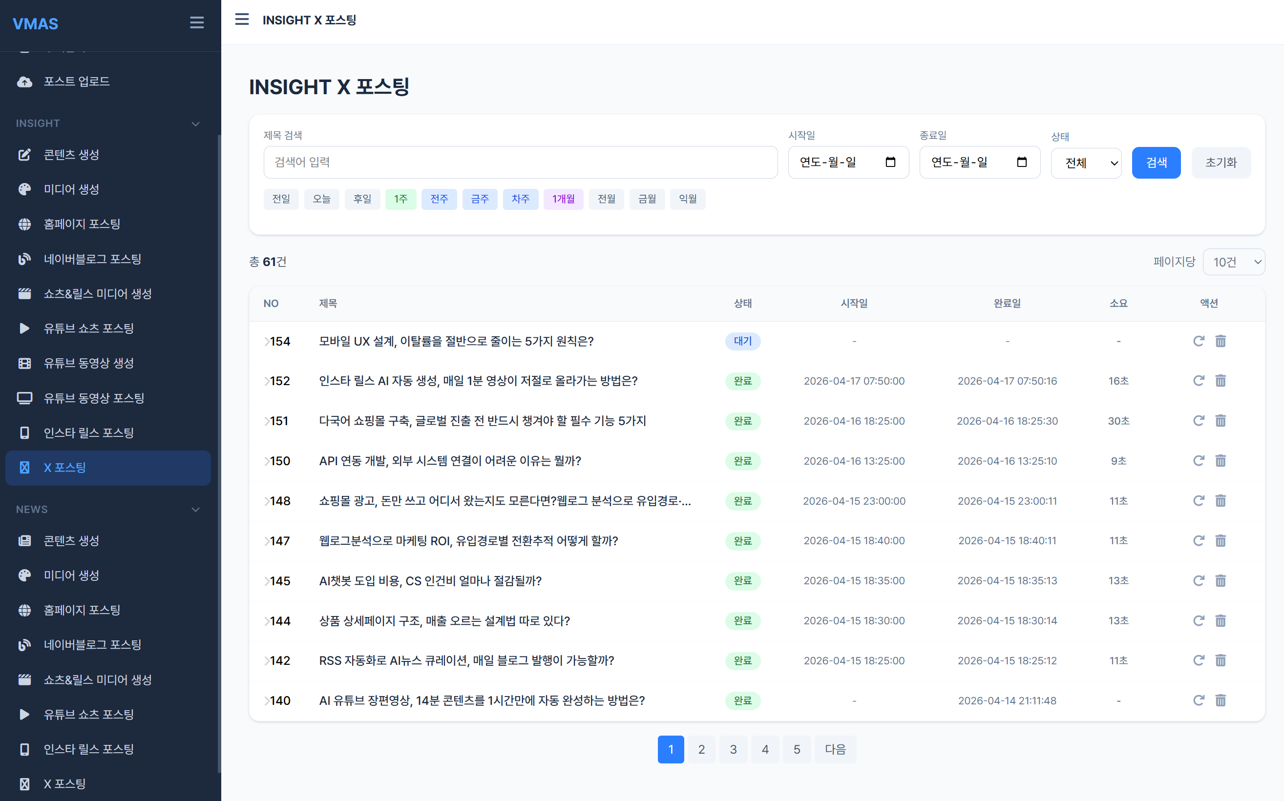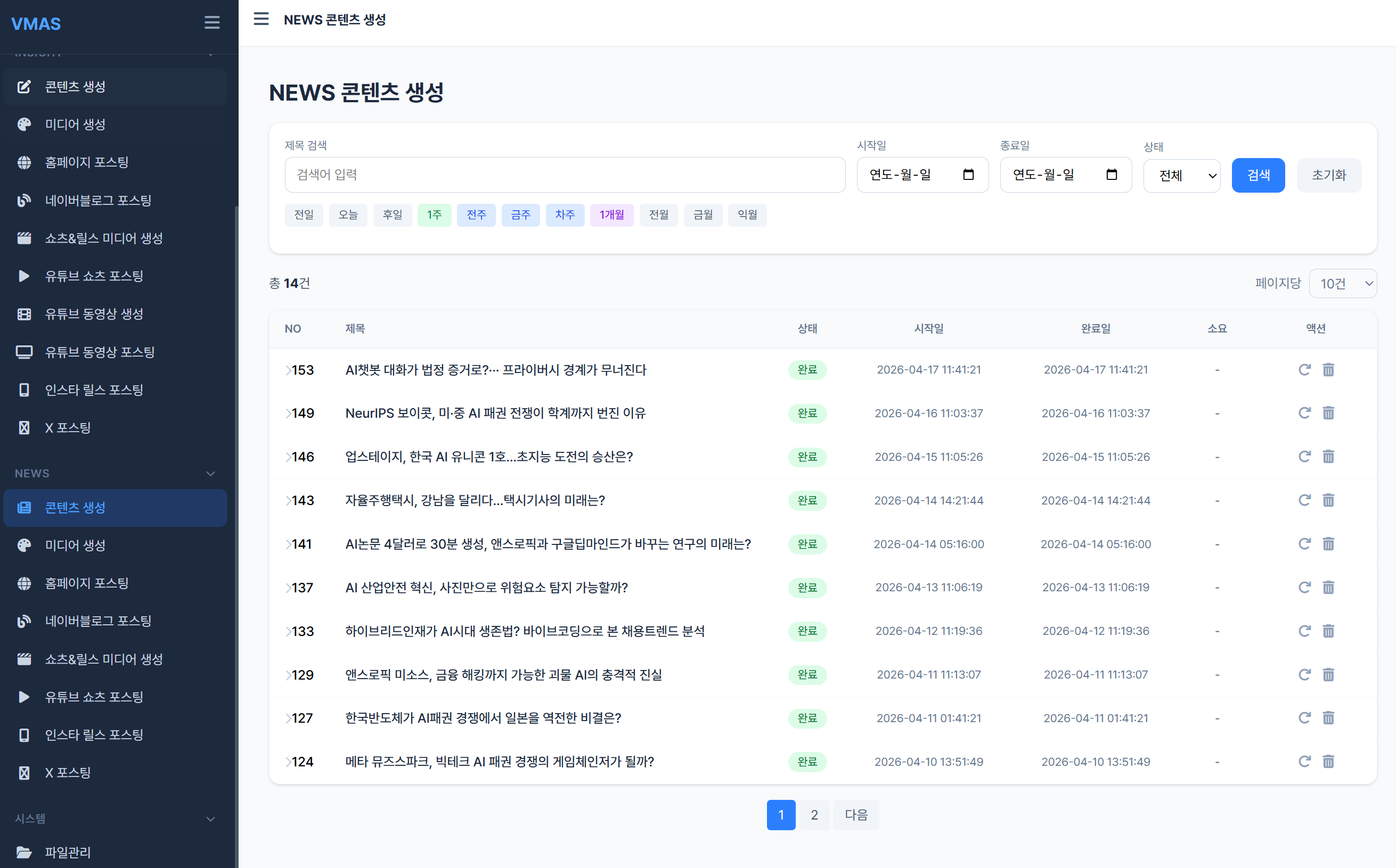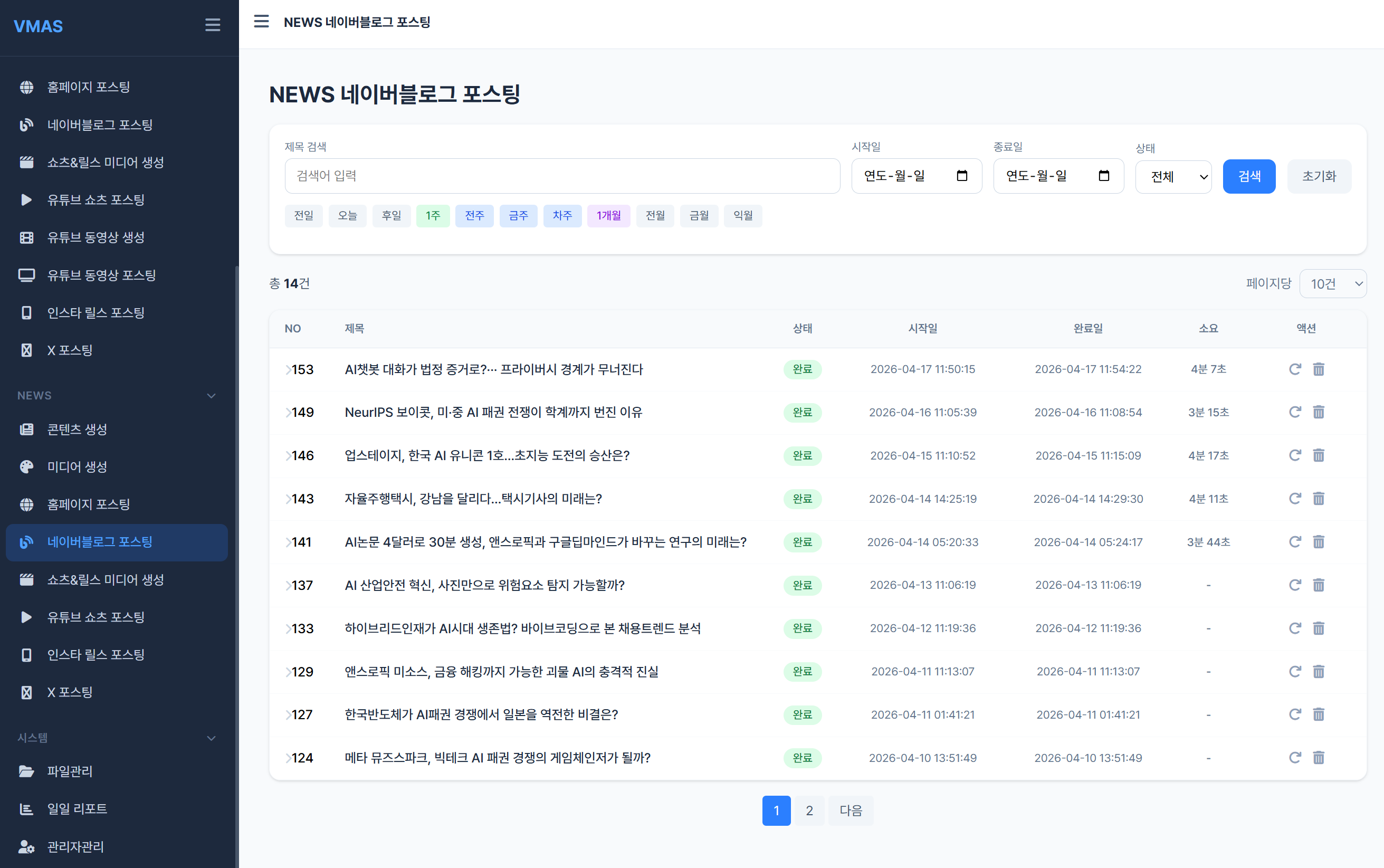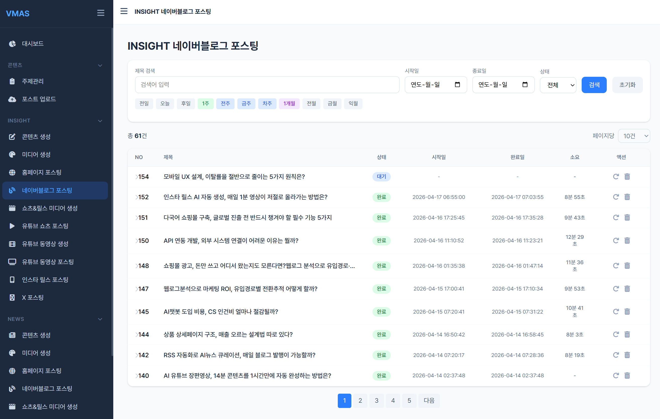 VMAS의 핵심은 단계별 포스팅 파이프라인입니다. 왼쪽 사이드바에서 각 단계의 진행 현황을 별도 메뉴로 확인할 수 있습니다.