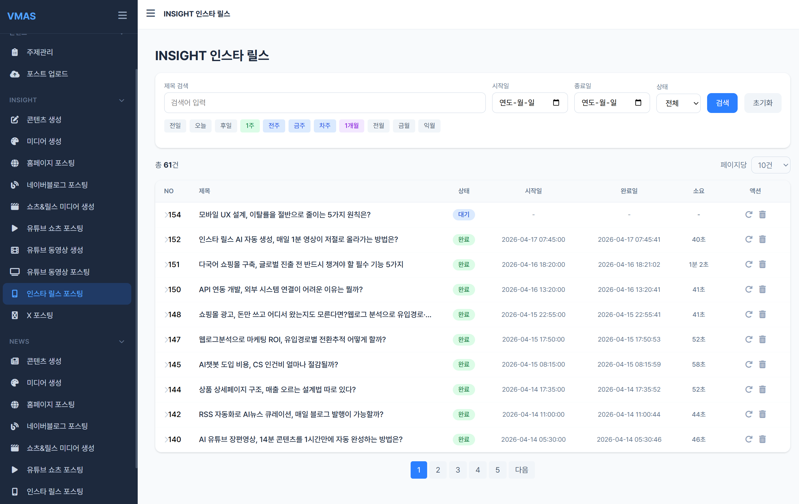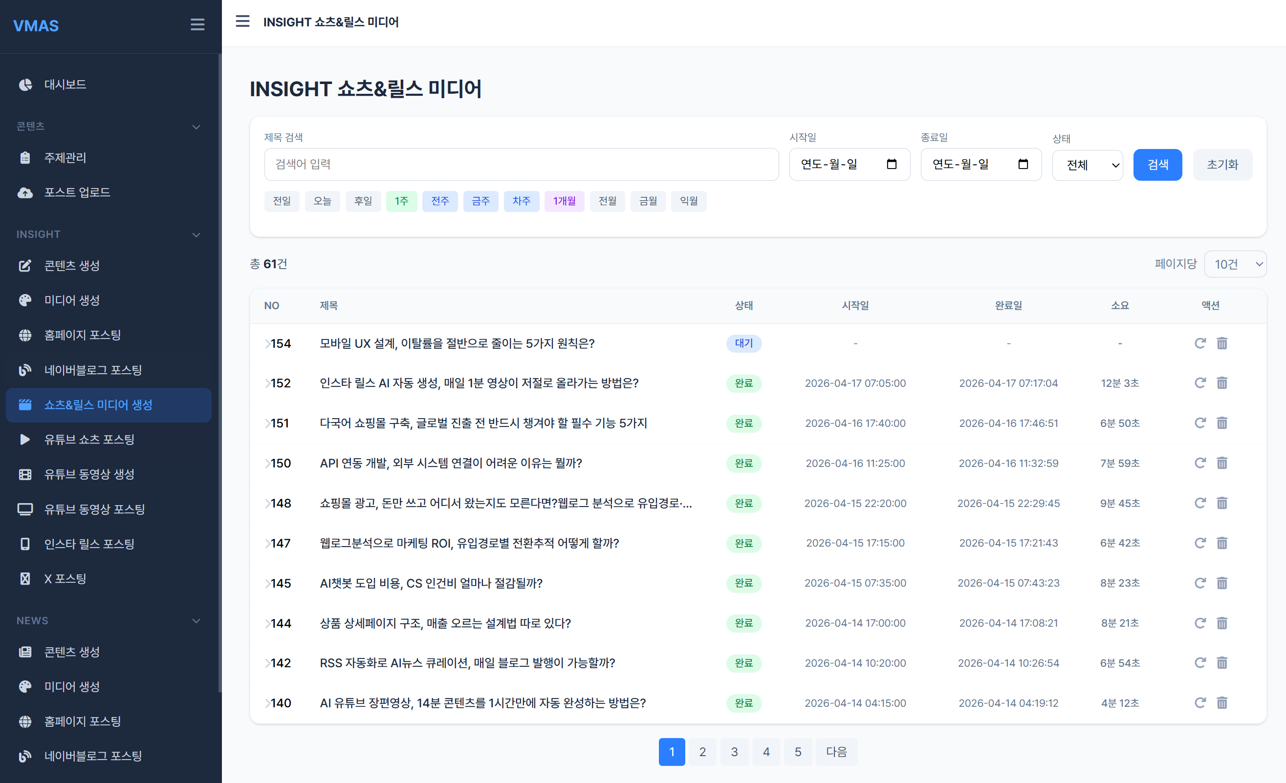 ▲ INSIGHT 쇼츠&릴스 미디어 생성 목록 — 9:16 이미지 10장 + 내레이션 + BGM이 합성된 영상