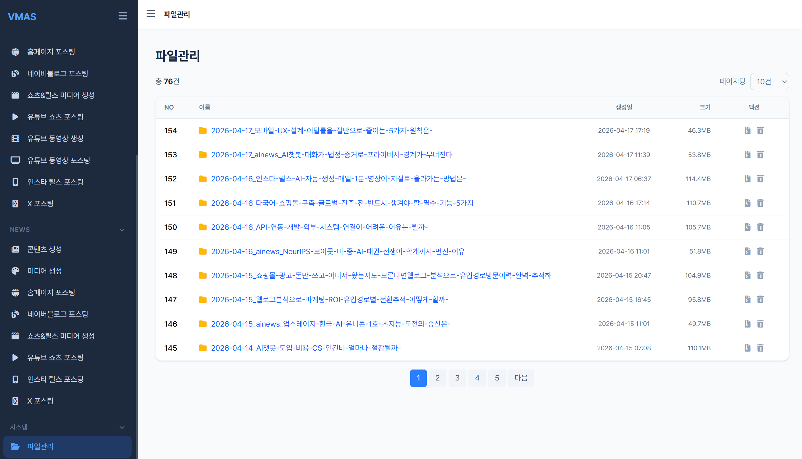 VMAS는 포스트 하나마다 고유 폴더를 만들어 모든 중간 산출물을 저장합니다. original.docx, parsed.json, markings.json, generated_image_N.png, generated_video_N.mp4, sns/short_video.mp4, youtube/video.mp4 등. 파일관리 메뉴에서 브라우저로 직접 열어보고, 다운로드하고, zip으로 전체 폴더를 받을 수 있습니다.