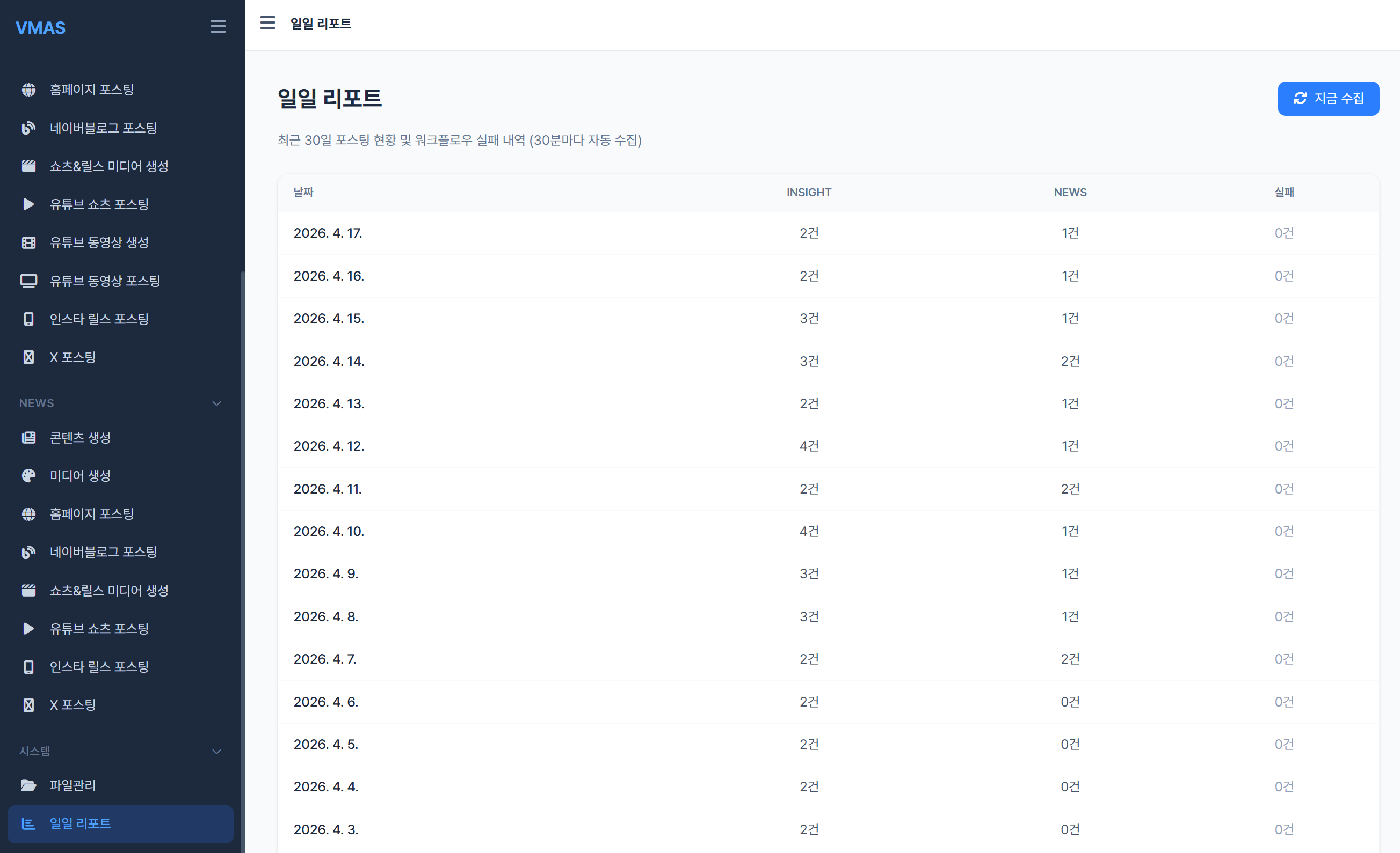 ▲ 일일 리포트 — 최근 30일간의 콘텐츠 제작·포스팅 현황과 실패 내역