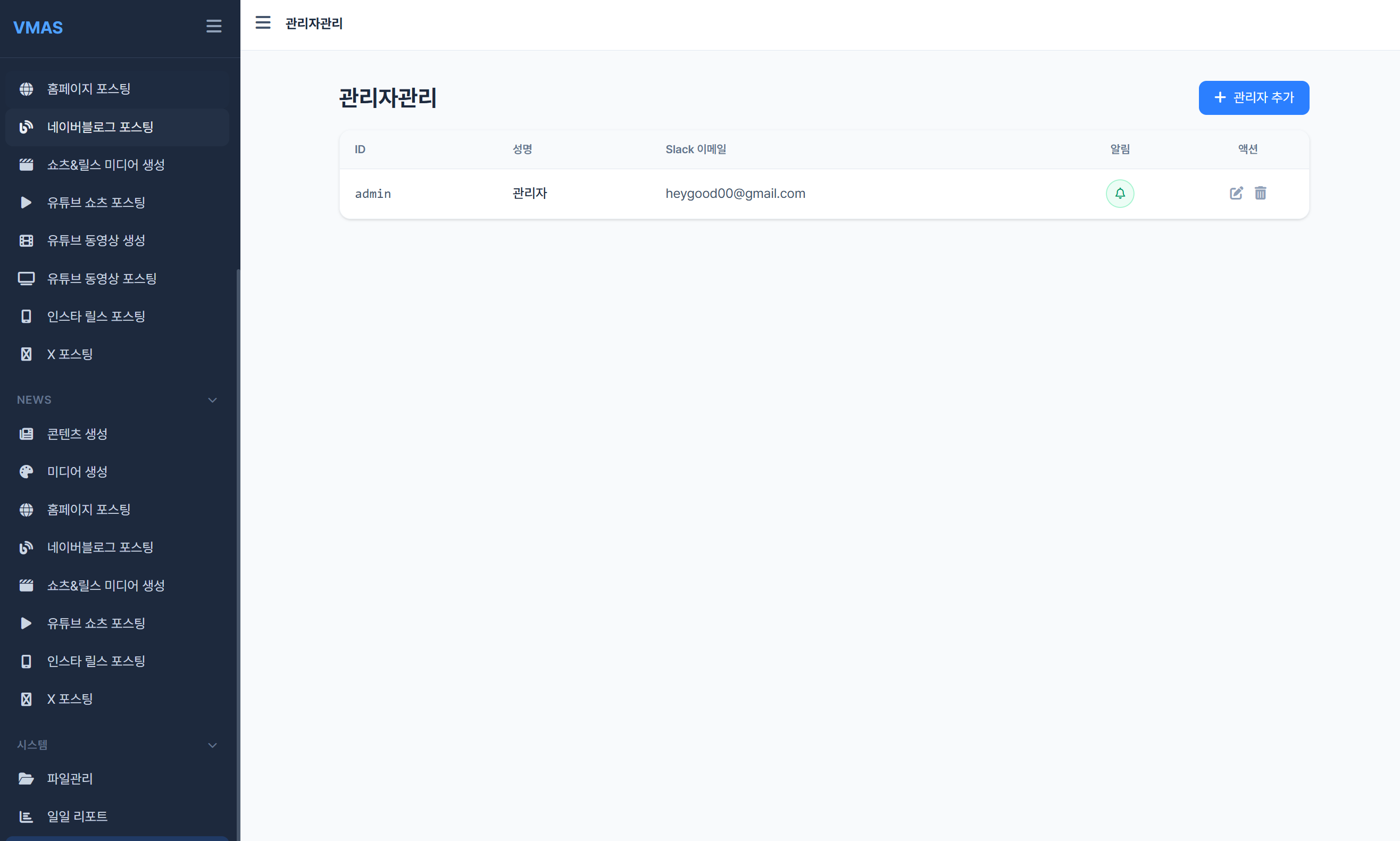 ▲ 관리자 관리 화면 — 여러 관리자 계정 등록 및 Slack 알림 이메일 지정