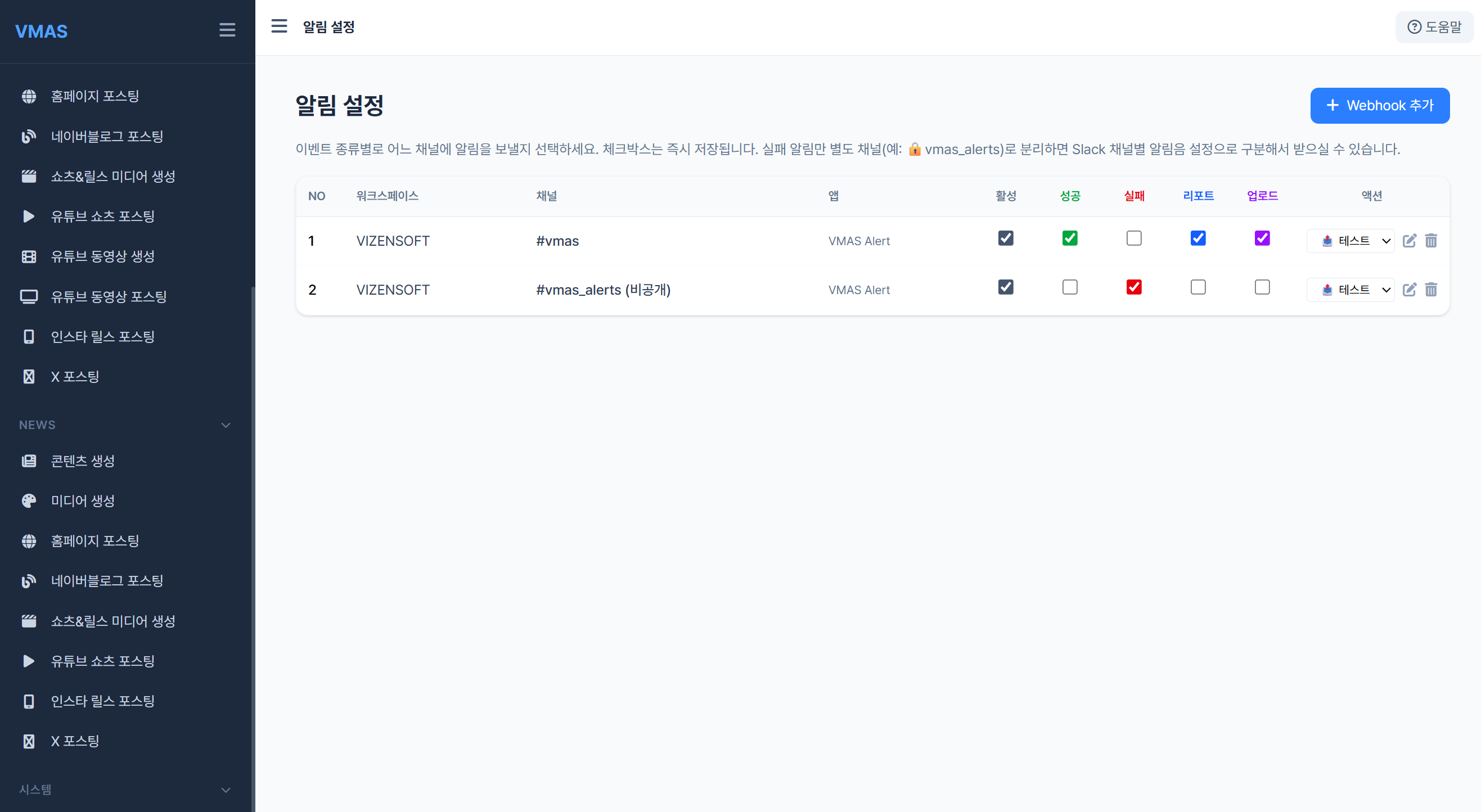 ▲ 알림 설정 화면 — Slack Webhook 여러 채널을 이벤트별로 관리