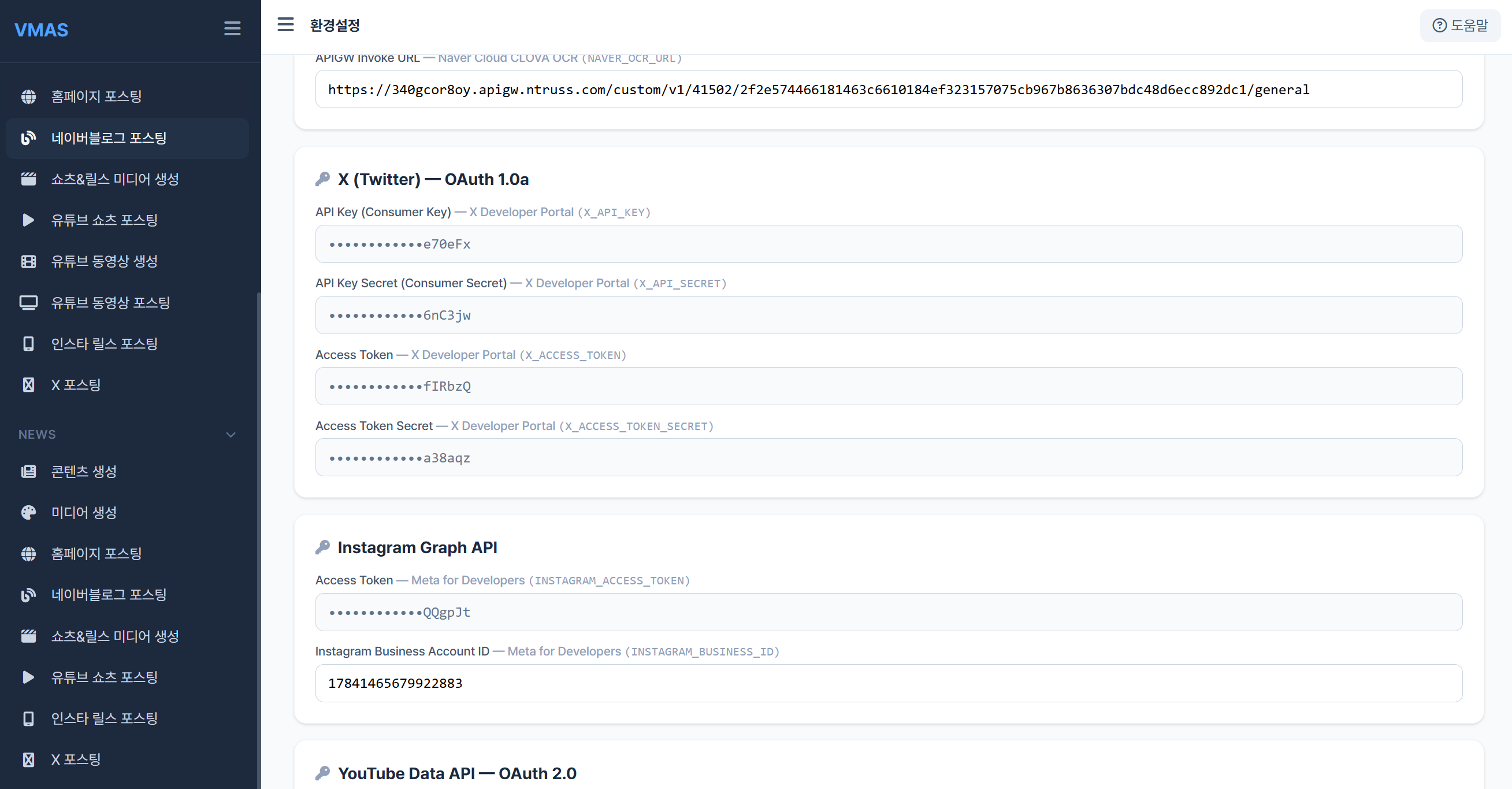 ▲ 환경설정 > API 키 — Anthropic, Google Gemini, Suno, RunwayML, Naver OCR, X, Instagram, YouTube 한 화면에서