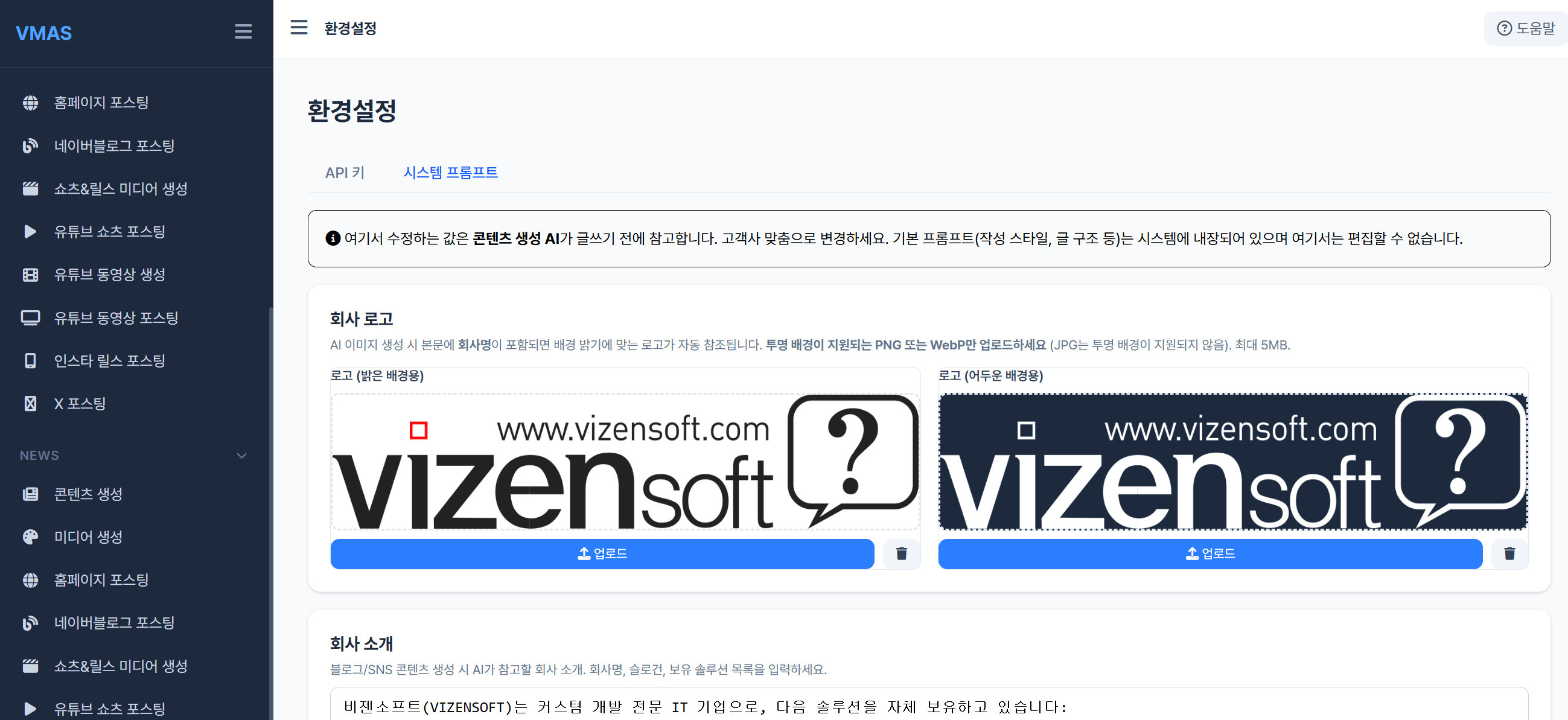 VMAS는 판매용 SaaS 솔루션입니다. 고객사마다 회사명·솔루션·톤이 다르기 때문에, 환경설정 하나로 전체 컨텐츠 생성 AI가 해당 고객사 기준으로 글을 쓰도록 구성됩니다.