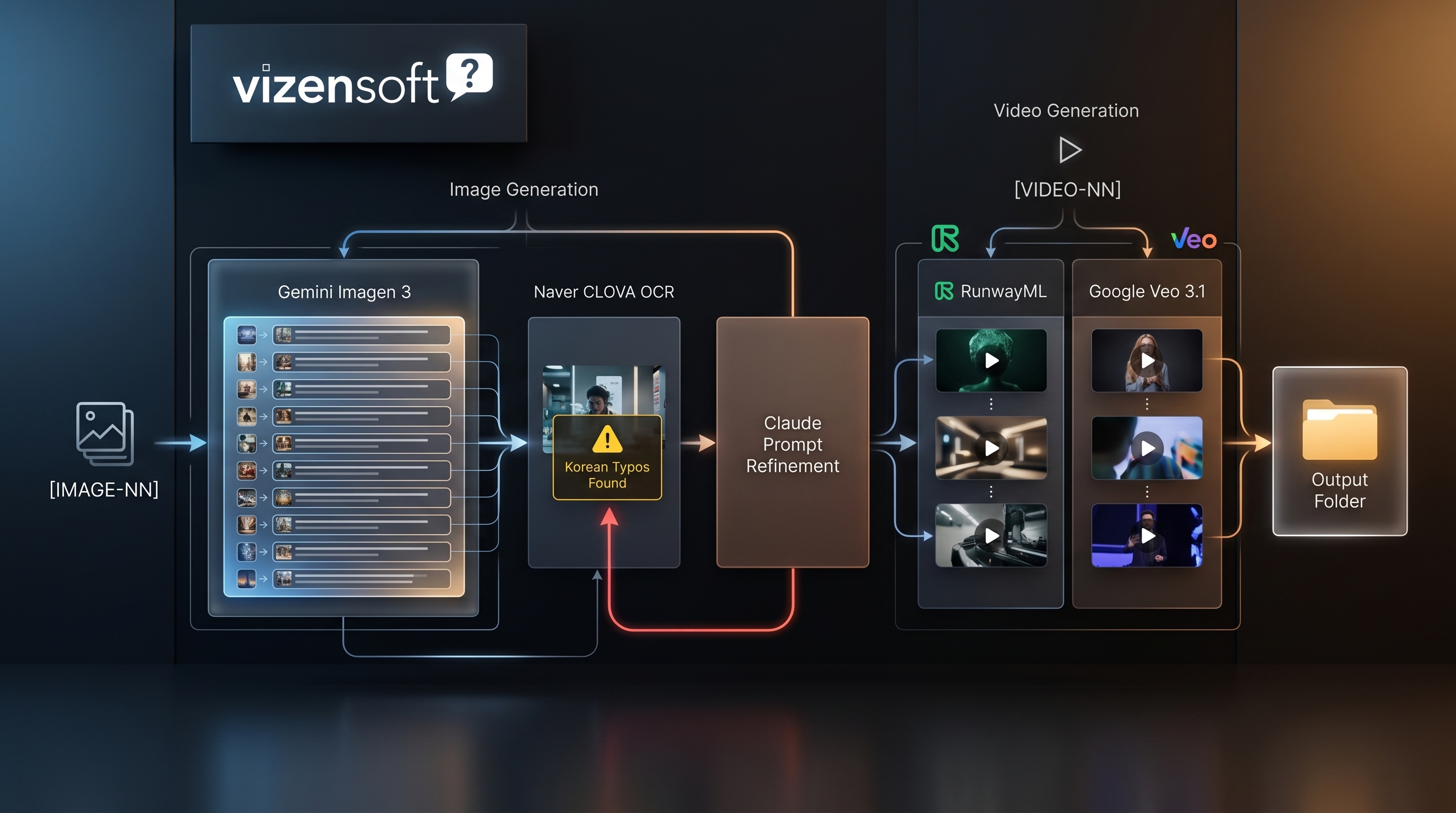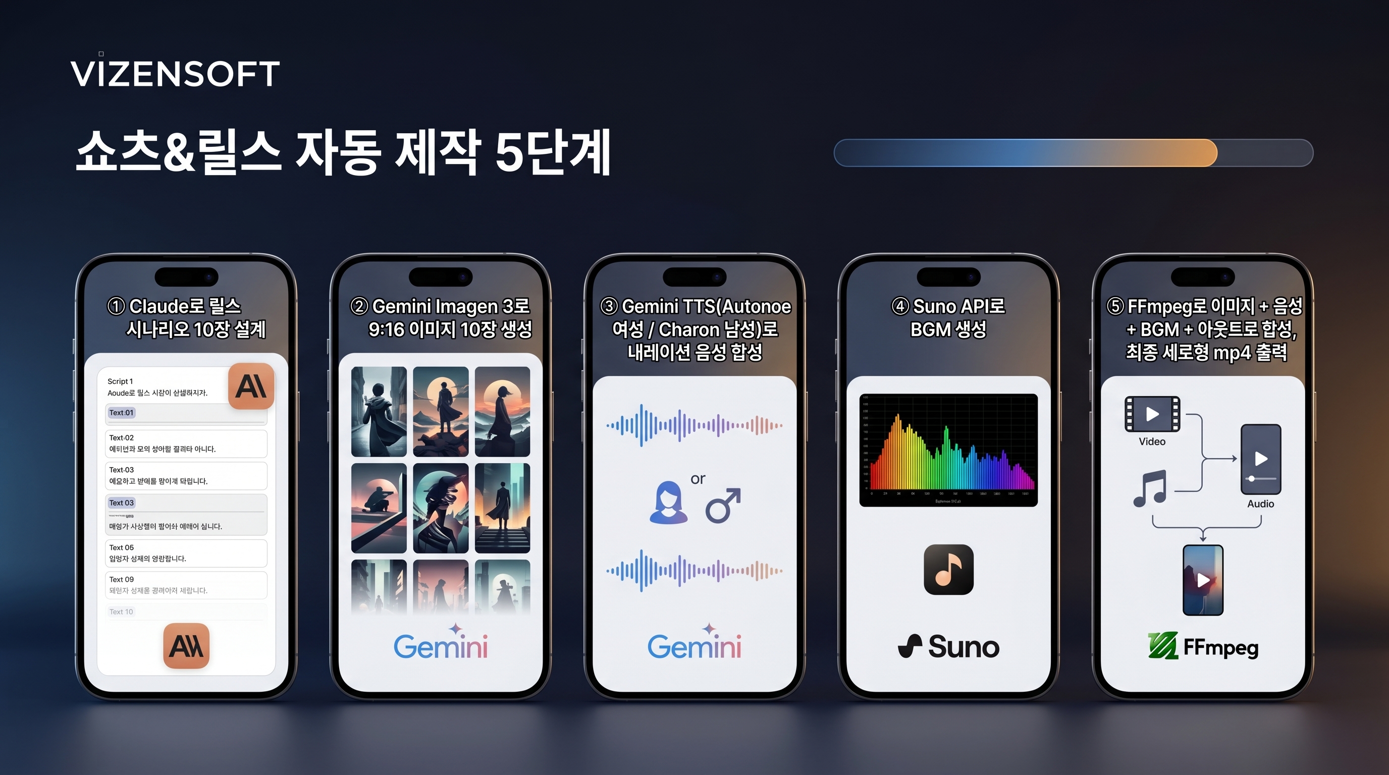 Gemini Imagen 3로 9:16 이미지 10장을 만들고, Claude가 내레이션 원고를 쓰고, Gemini TTS(Autonoe/Charon 음성)로 음성 합성, Suno API로 BGM 생성, FFmpeg로 합성합니다. 마지막 이미지는 비젠소프트 브랜드 아웃트로가 고정으로 붙습니다.