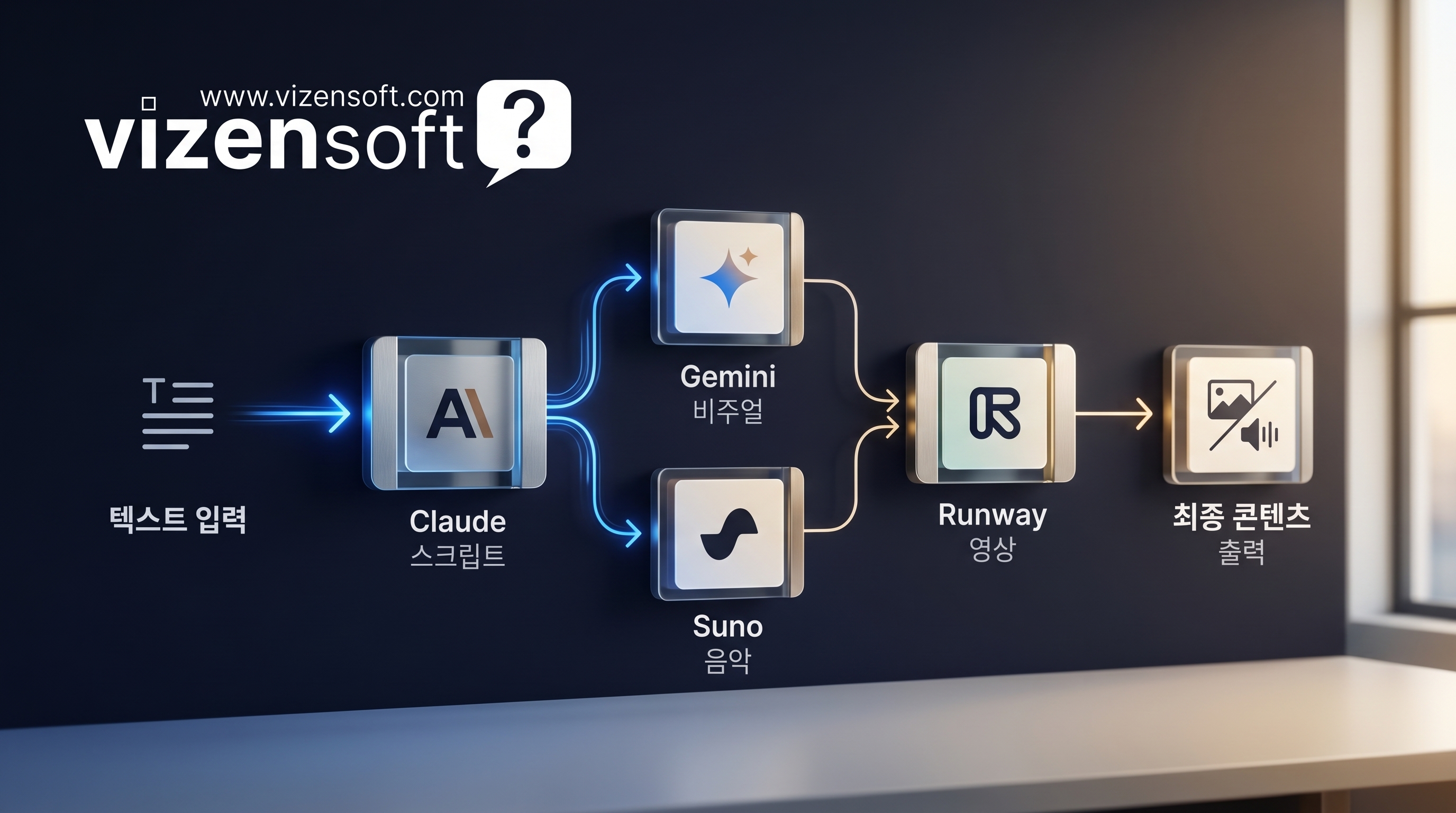 그런데 만약 이 모든 과정을, 텍스트 아이디어 하나를 입력하는 것만으로 자동화할 수 있다면 어떨까요? AI 파이프라인이 바로 그 해답입니다. Claude가 스크립트를 쓰고, Gemini가 장면을 설계하고, Suno가 배경음악을 만들고, Runway가 영상을 완성하는 일련의 자동화 흐름, 즉 텍스트→스크립트→이미지→음악→영상으로 이어지는 엔드투엔드(End-to-End) AI 파이프라인이 이미 현실에서 가동되고 있습니다.