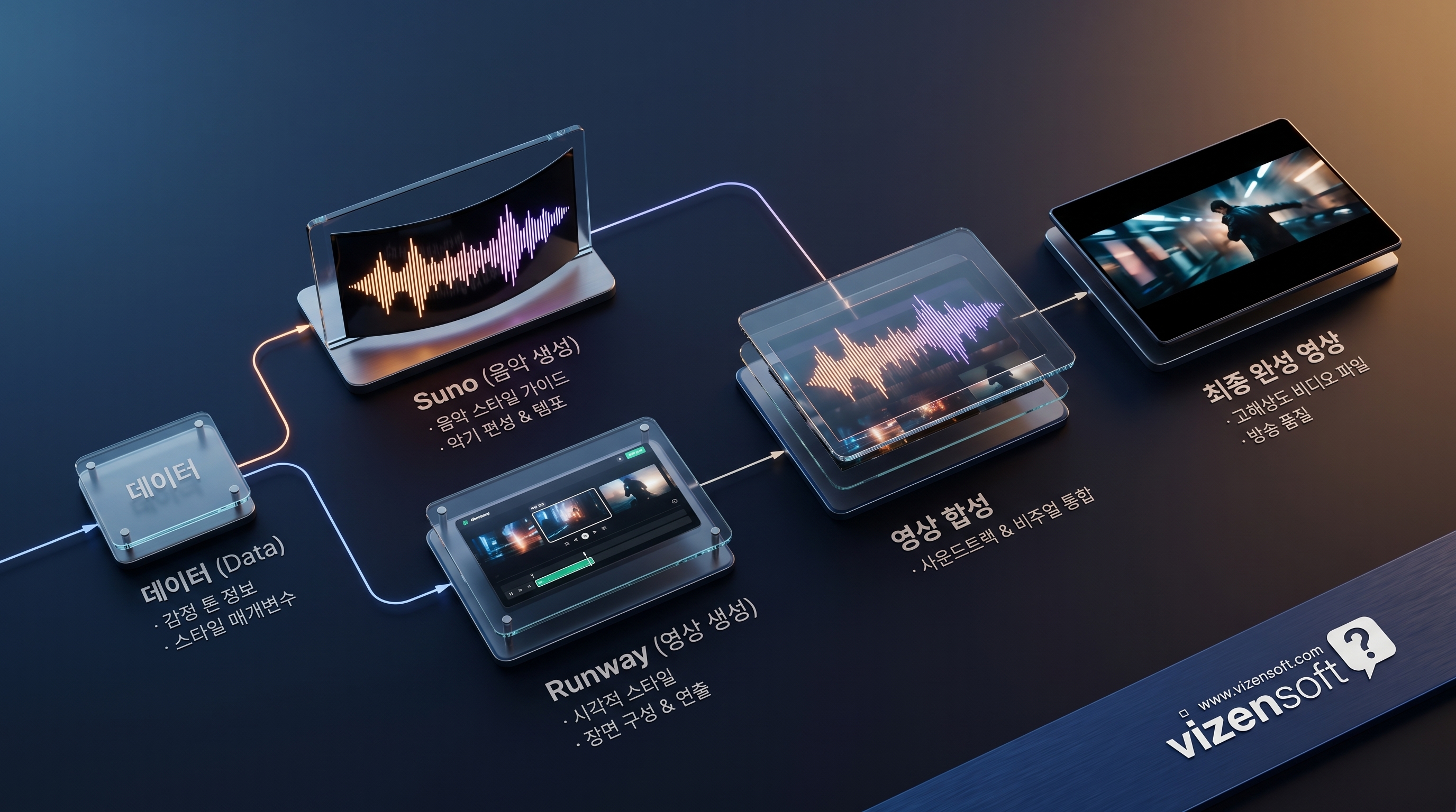 이제 파이프라인의 후반부입니다. 스크립트와 이미지가 준비되었다면, 이를 실제 움직이는 영상으로 만들고 여기에 감정을 불어넣는 음악을 더해야 합니다. 이 두 역할을 Suno(음악 생성)와 Runway(영상 생성)가 담당합니다.