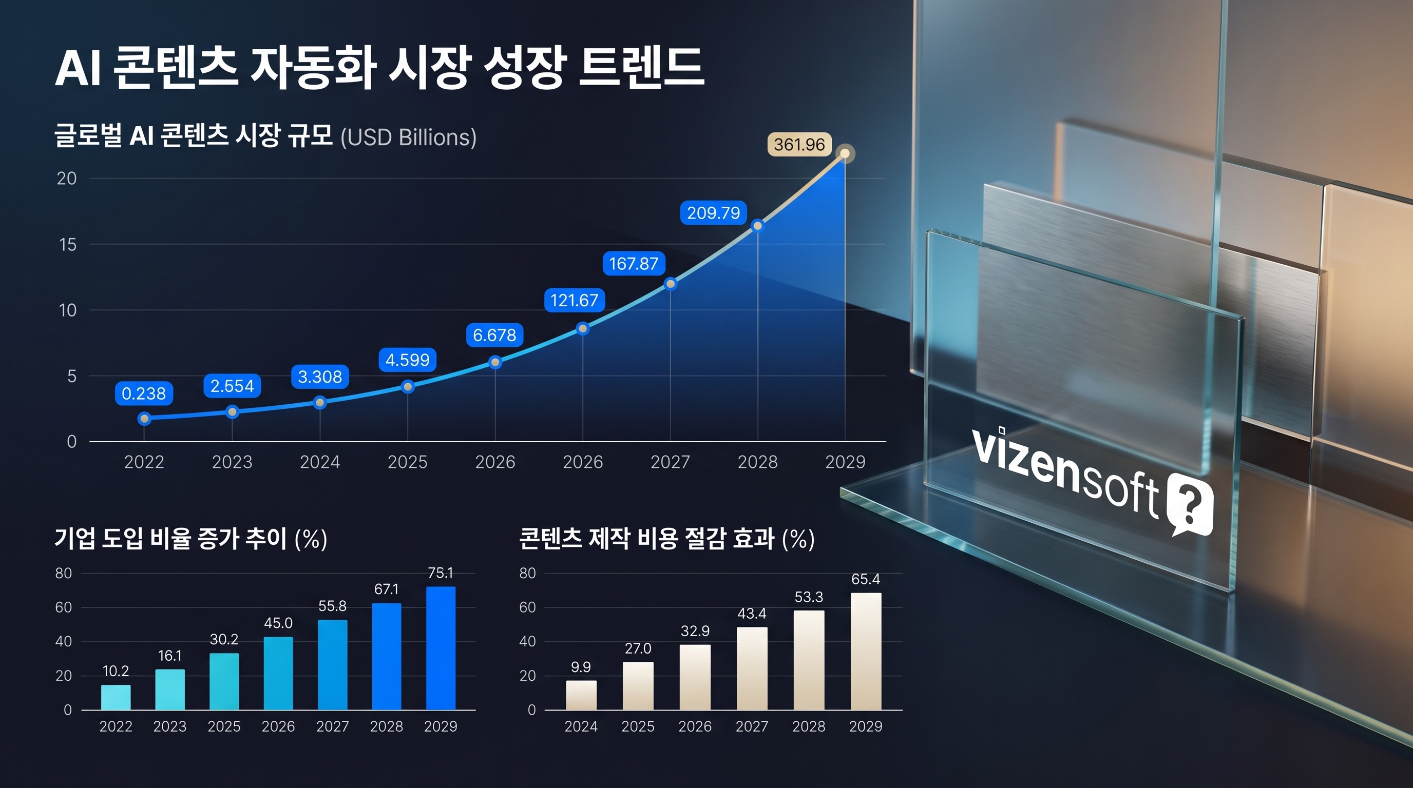 먼저 시장 규모 측면에서, 글로벌 AI 콘텐츠 생성 시장은 2024년 약 $5.5B(한화 약 7.5조원) 규모에서 2029년까지 연평균 성장률(CAGR) 30.6%로 성장하여 $20.9B에 달할 전망입니다(MarketsandMarkets 2024). 이 성장의 주축은 바로 마케팅 콘텐츠 자동화 파이프라인입니다.