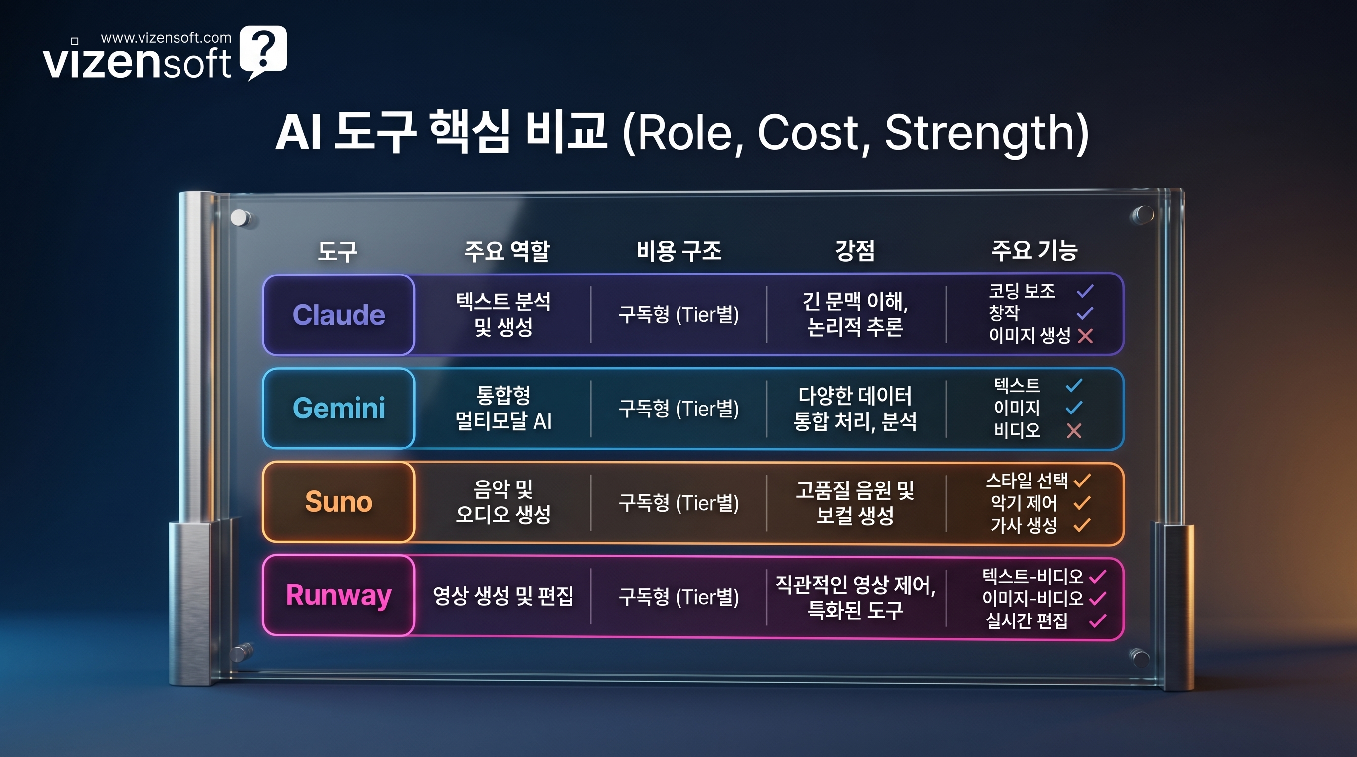 | 구분 | Claude (Anthropic) | Gemini (Google) | Suno | Runway |