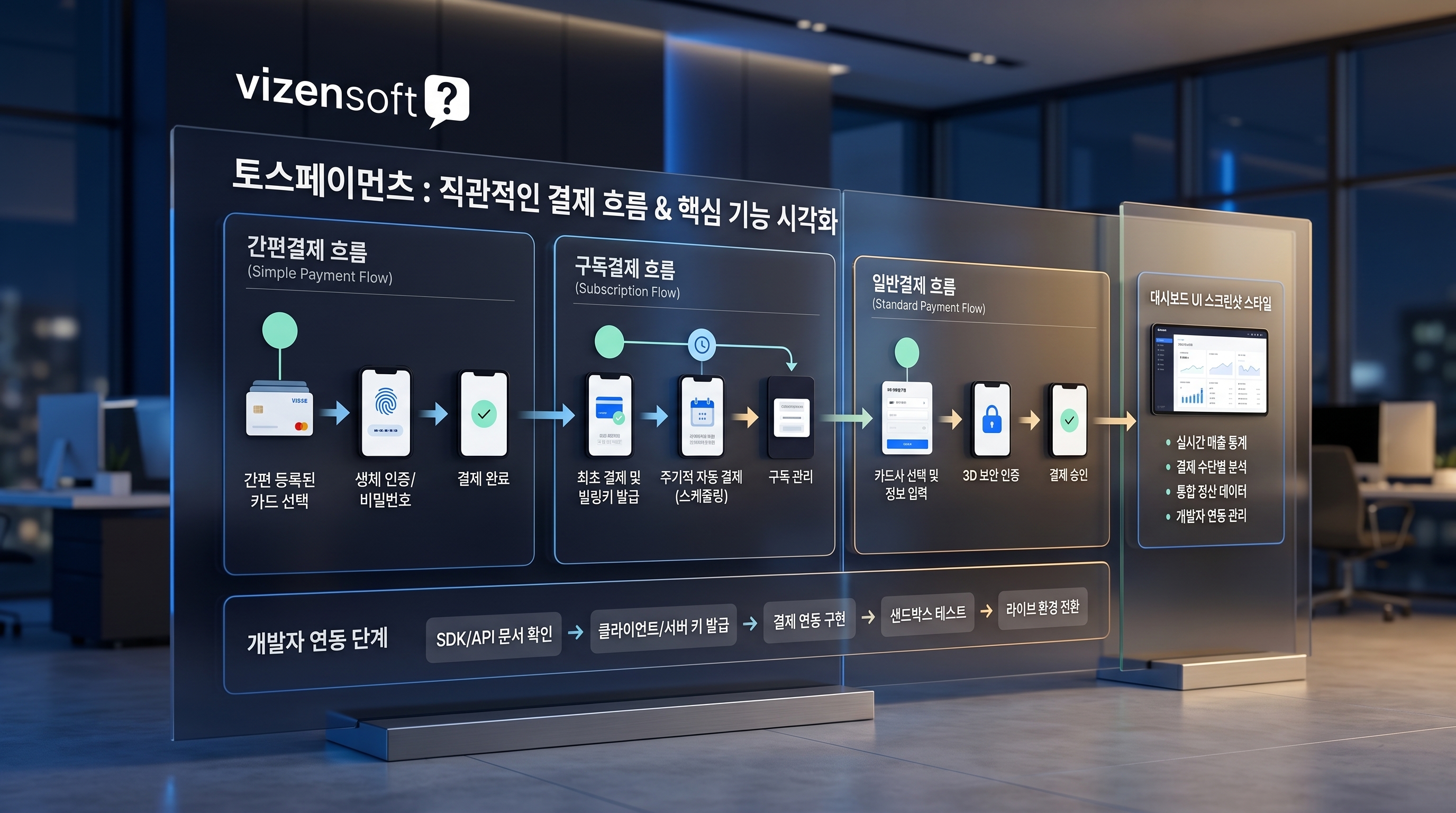 기본적인 신용카드 + 간편결제 연동은 5~10 영업일 내에 완료 가능합니다. 구독결제(정기 빌링), 에스크로, 부분취소, ERP 연동 등 고급 기능이 포함되면 3~6주가 소요될 수 있습니다. 비젠소프트는 프로젝트 규모에 따라 상세 일정을 협의하여 제안드립니다.
