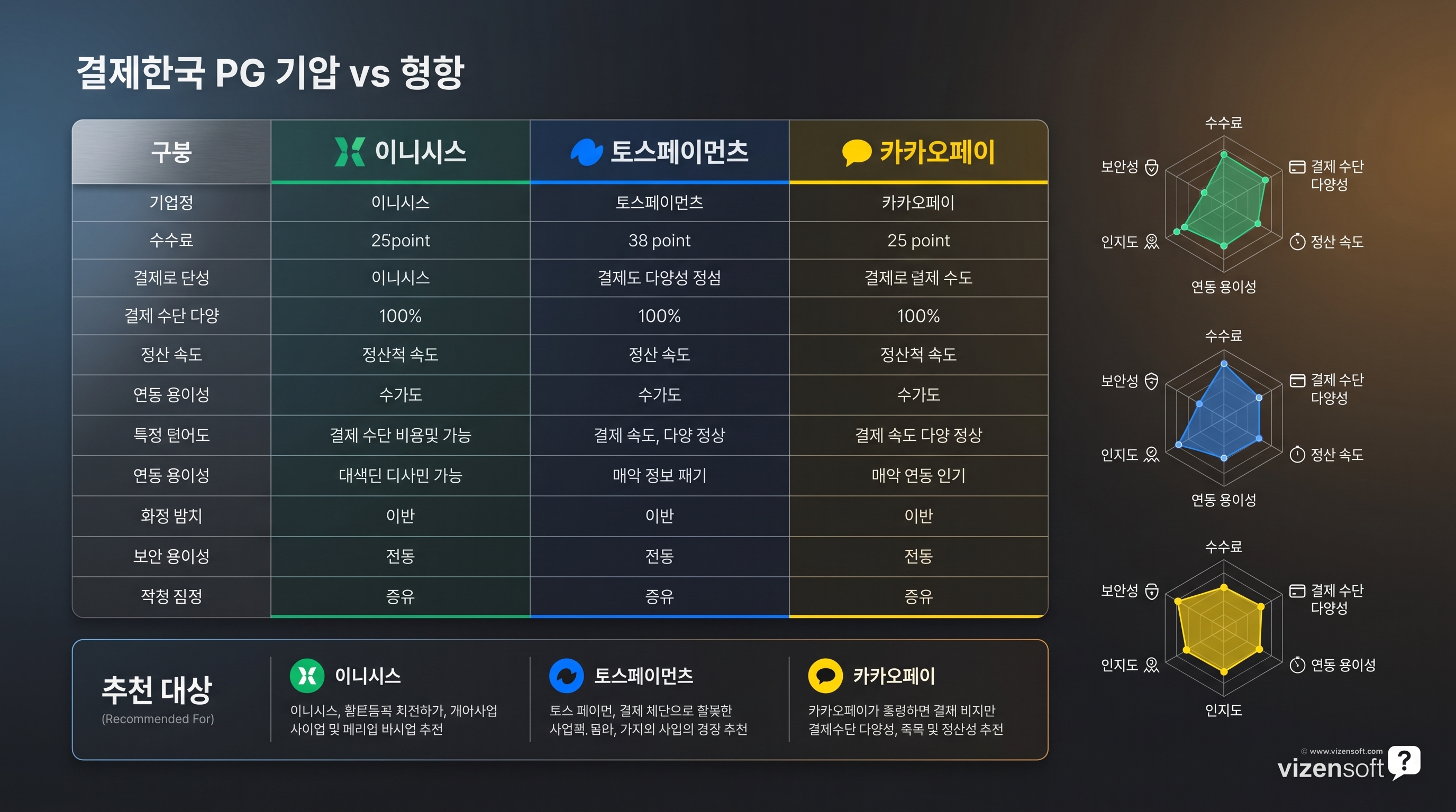 둘째, 이니시스는 안정성과 신뢰, 토스페이먼츠는 개발 편의성과 현대적 UX, 카카오페이는 간편결제 전환율 — 각자의 강점이 분명히 다릅니다.