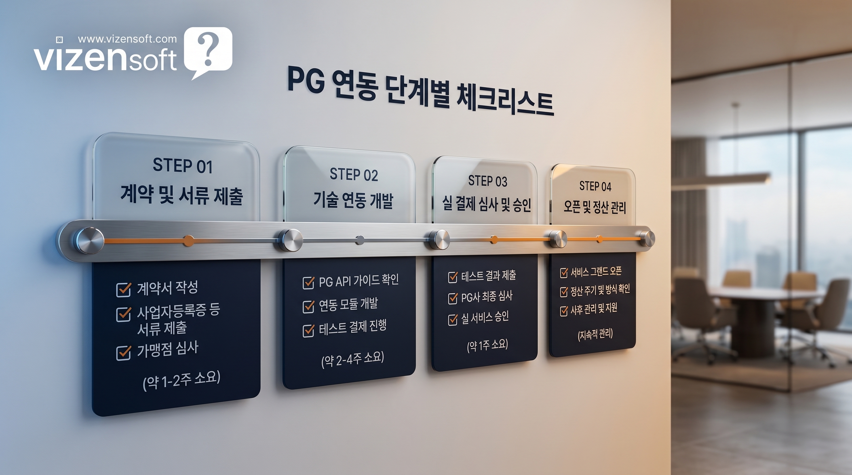 | PG사 신청·심사 | 3~10 영업일 | 서류 완비 여부 | 없음 (가맹점 수수료는 운영 후) |