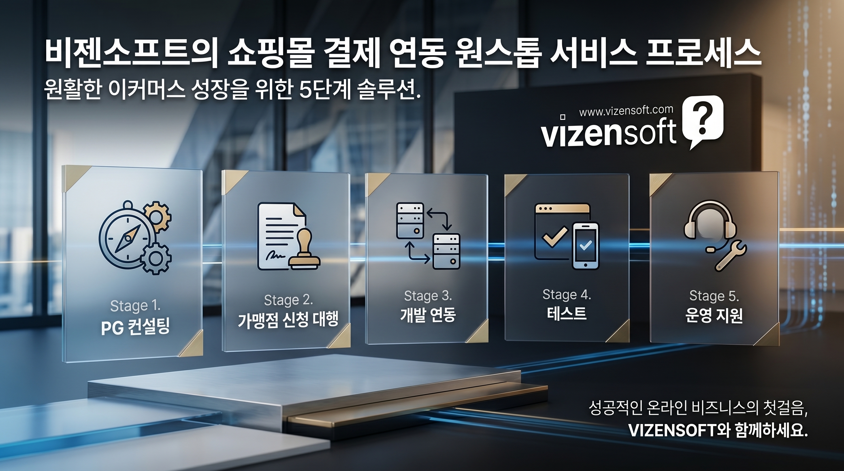 비젠소프트는 PG사 선택 컨설팅 → 가맹점 신청 대행 → API 개발 연동 → 테스트 → 상용 전환 → 사후 유지보수까지 전체 과정을 원스톱으로 제공합니다. 이니시스, 토스페이먼츠, 카카오페이 모두 연동 경험을 보유하고 있으며, 자체 쇼핑몰 구축과 결제 연동을 함께 진행하시는 경우 더욱 효율적인 비용과 일정으로 프로젝트를 진행하실 수 있습니다. 문의는 아래 서명 블록을 참고해 주세요.