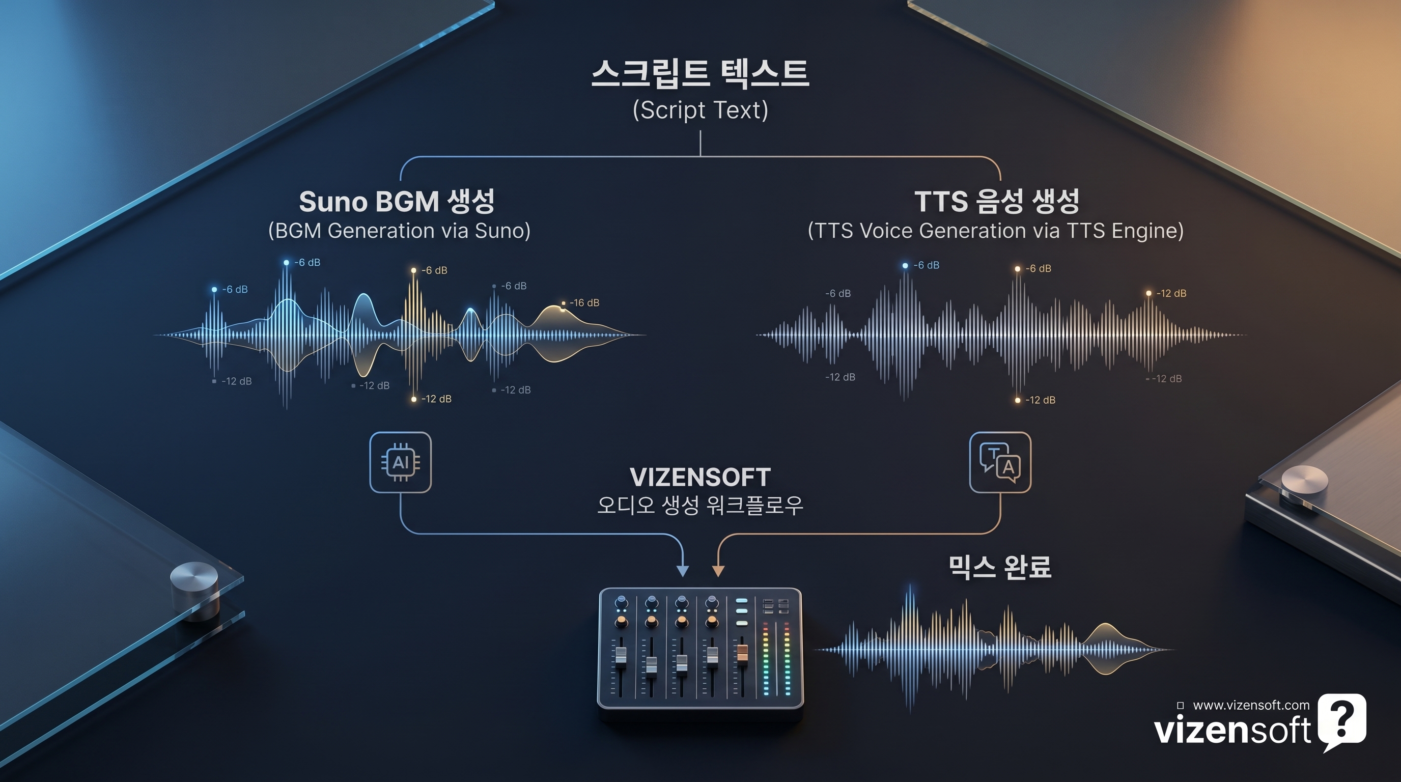 이 세 트랙을 FFmpeg에서 믹싱하면 프로페셔널 수준의 사운드 레이어가 완성됩니다.