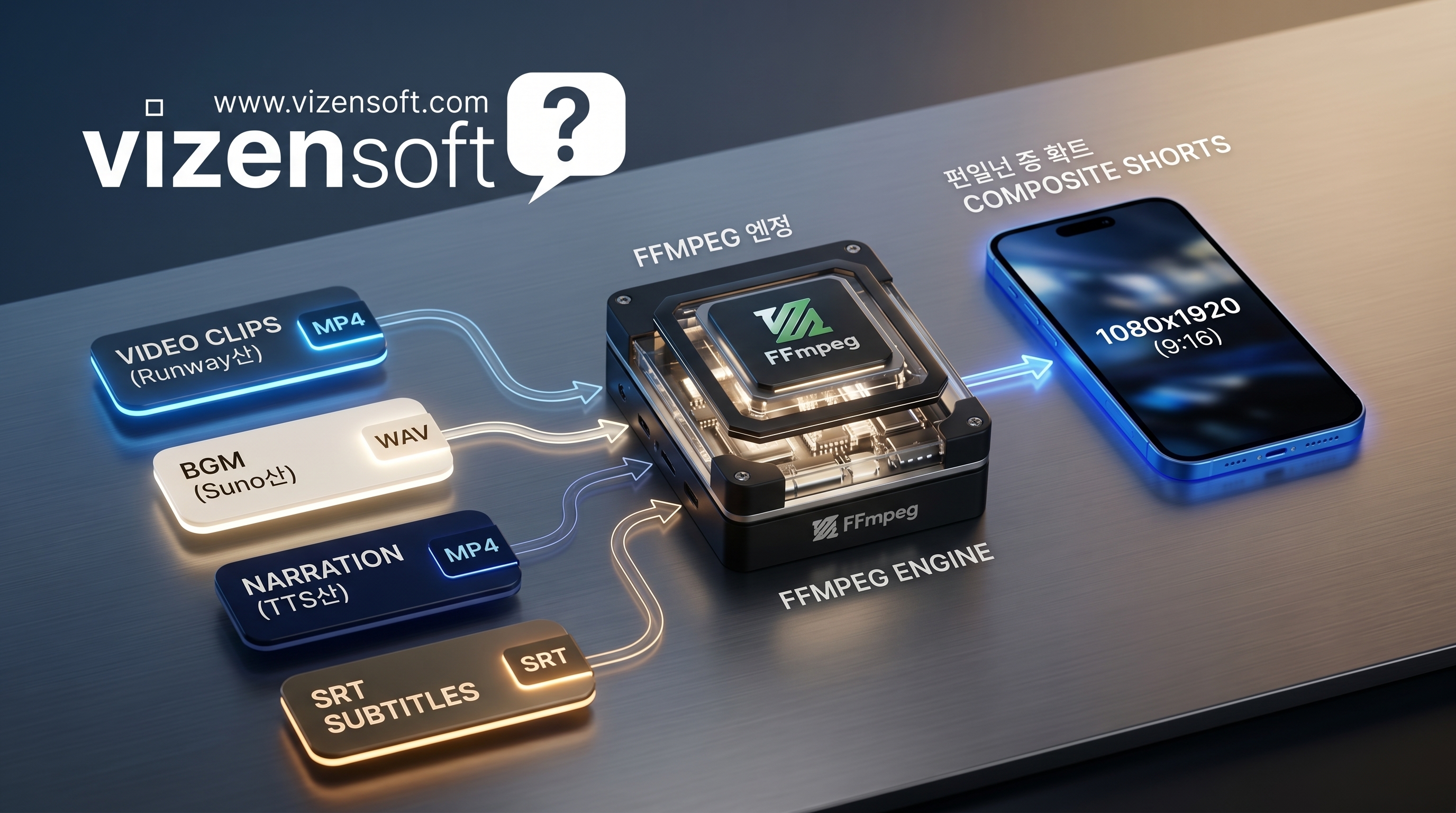FFmpeg은 오픈소스 멀티미디어 처리 엔진으로, 영상·음성·이미지 파일을 명령어 기반으로 합성, 변환, 편집할 수 있는 강력한 도구입니다. 쇼츠 AI 자동화 워크플로우에서 FFmpeg은 최종 합성(Rendering) 단계를 담당하는 핵심 엔진입니다. 앞서 Gemini와 Runway가 만든 비주얼 클립, Suno가 만든 BGM, TTS가 만든 나레이션을 FFmpeg이 하나의 완성형 쇼츠 영상으로 통합합니다.