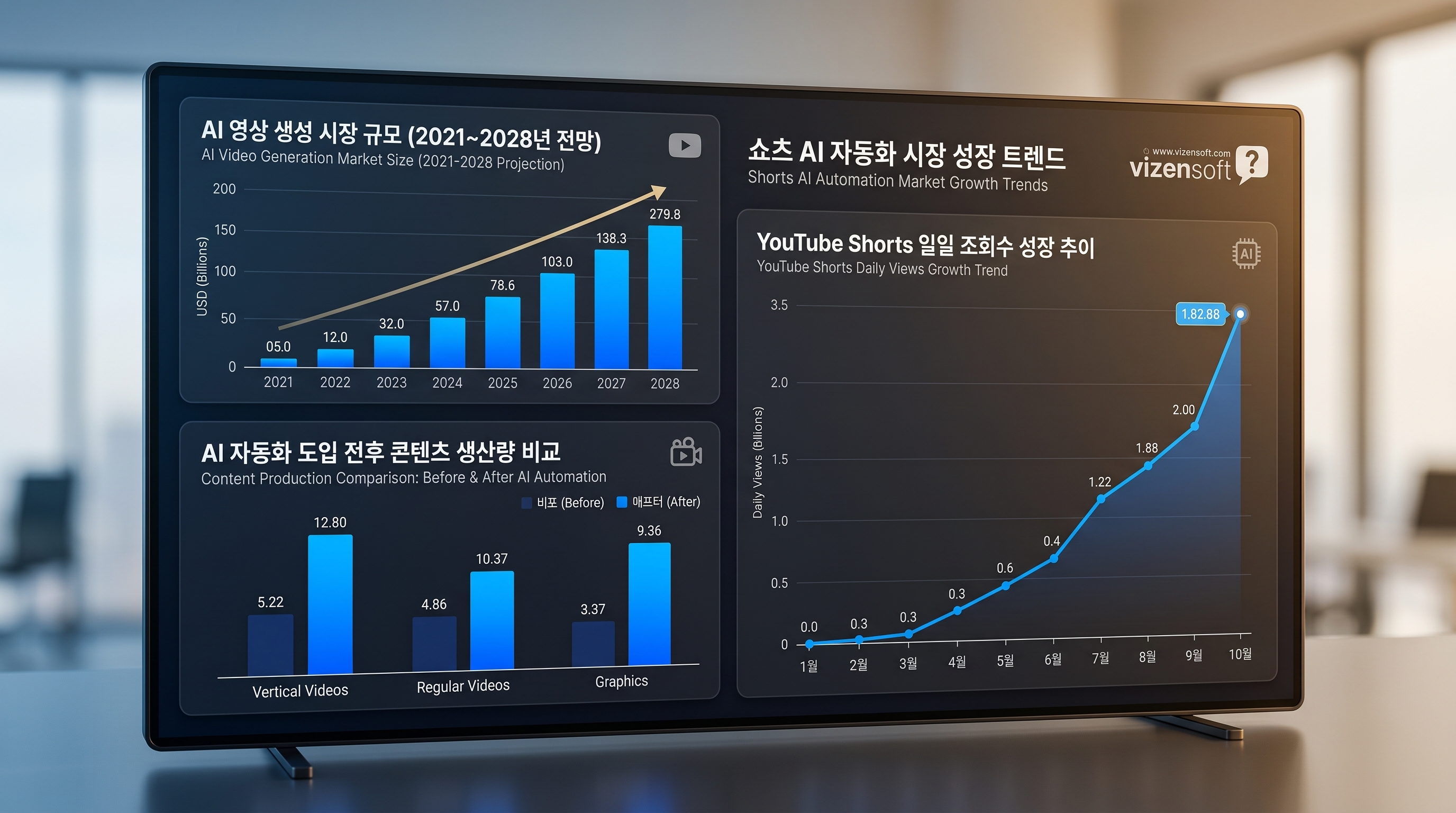 YouTube Shorts는 2024년 기준 일일 조회수 700억 회를 돌파했고, 월간 시청자 수는 20억 명을 넘어섰습니다. 이는 전년 대비 2배 이상 성장한 수치입니다. 동시에 AI 영상 생성 시장은 2023년 약 5억 달러에서 2028년 30억 달러를 초과할 것으로 예상되며, 연평균 성장률(CAGR)은 43%에 달합니다.