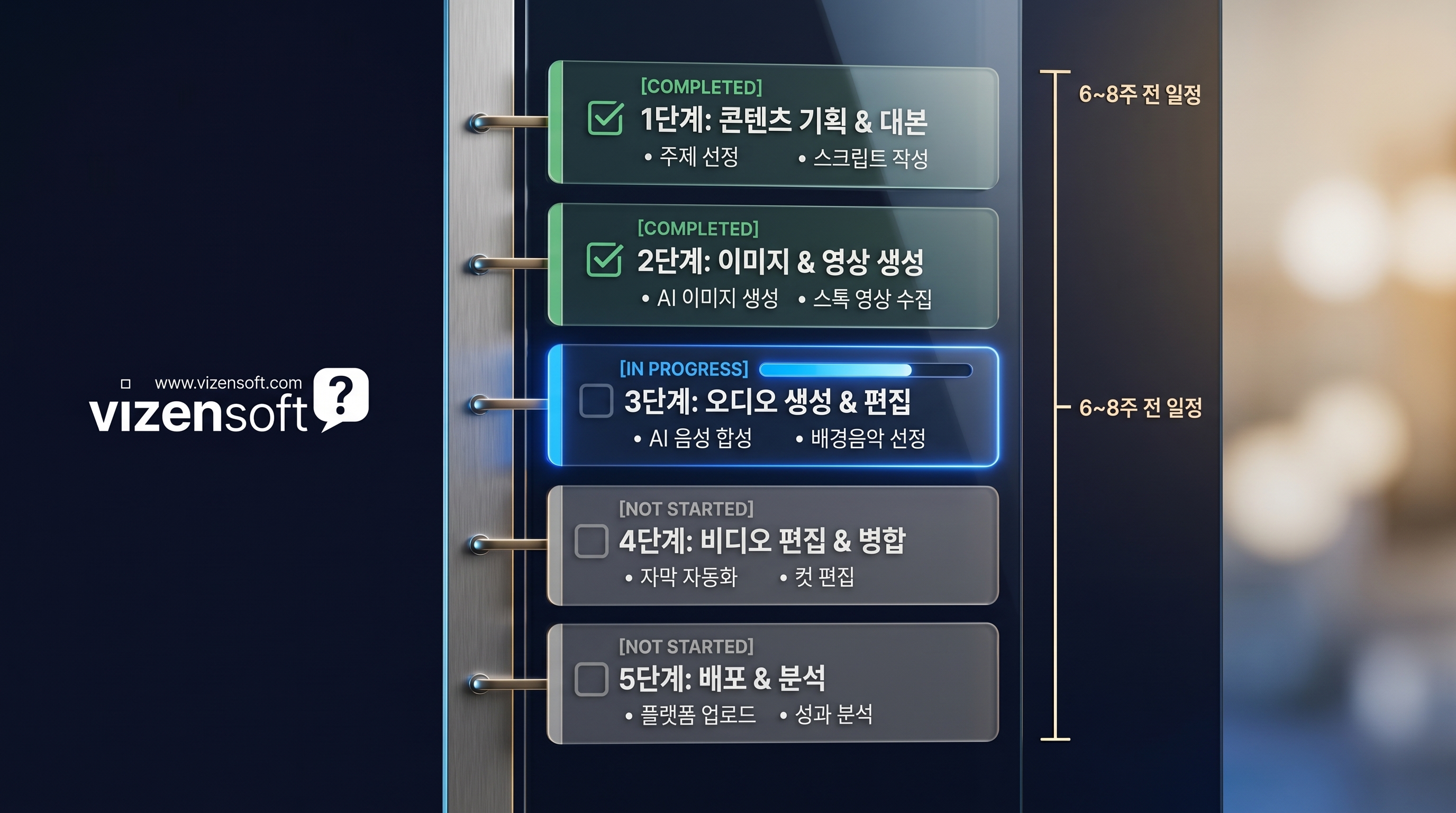 A. 체크리스트에 명시된 대로, 처음부터 구축하면 약 6~8주가 소요됩니다. 비젠소프트 같은 전문 파트너와 협업 시 이를 2~3주로 단축할 수 있으며, 기존 인프라와의 통합 요건에 따라 기간이 달라질 수 있습니다. 도입을 고려 중이시라면 아래 서명 블록을 참고해 문의해 주세요.