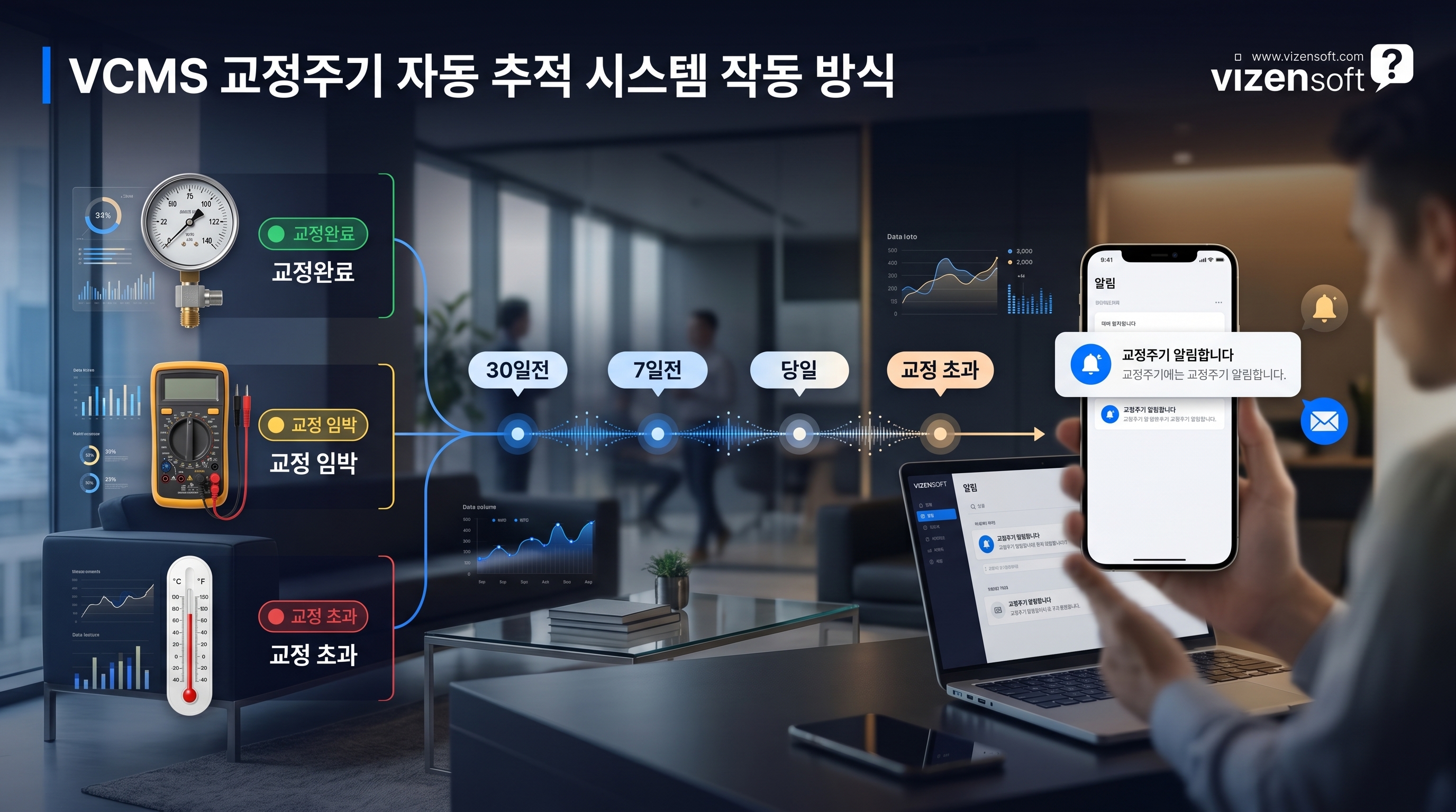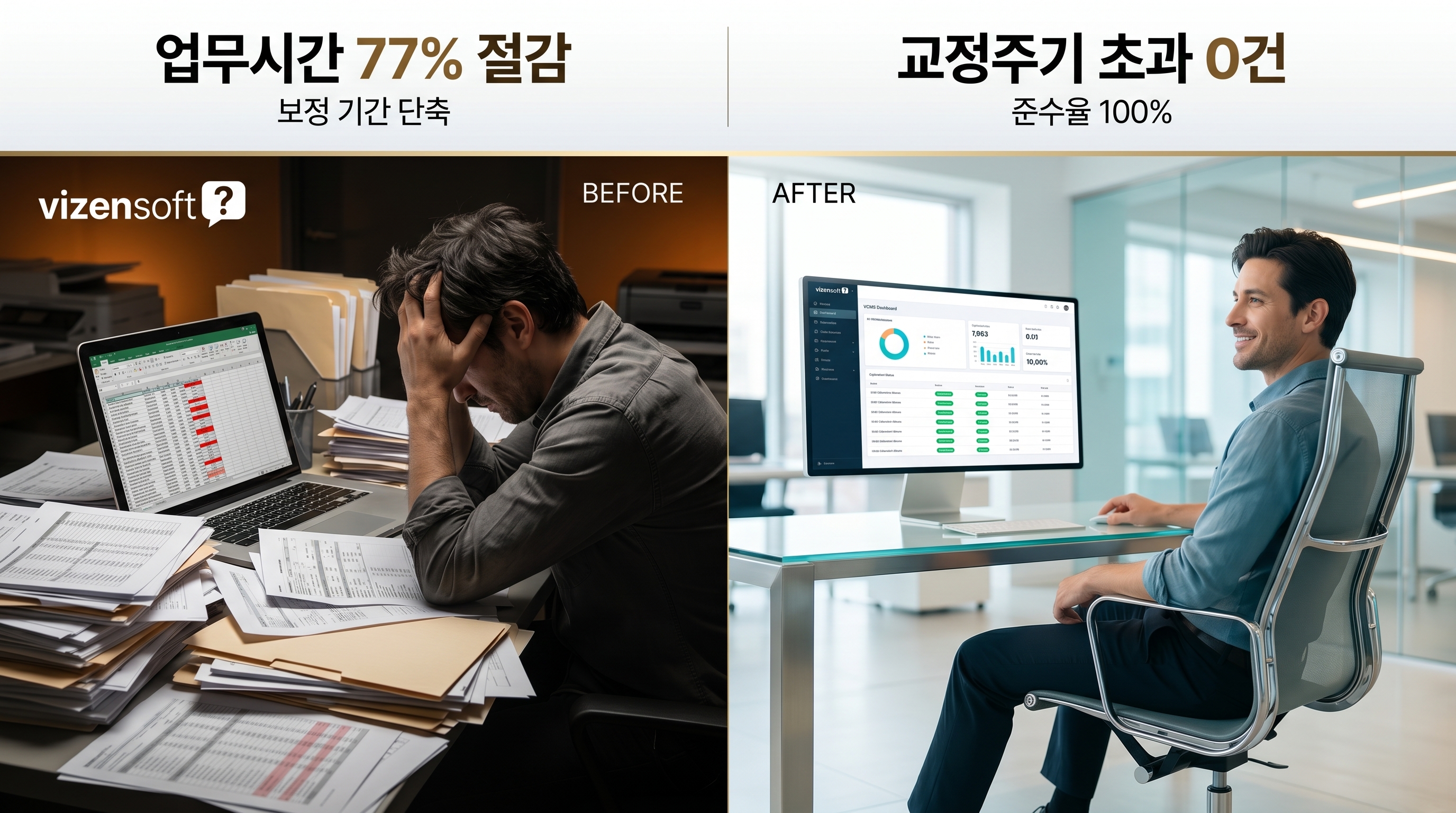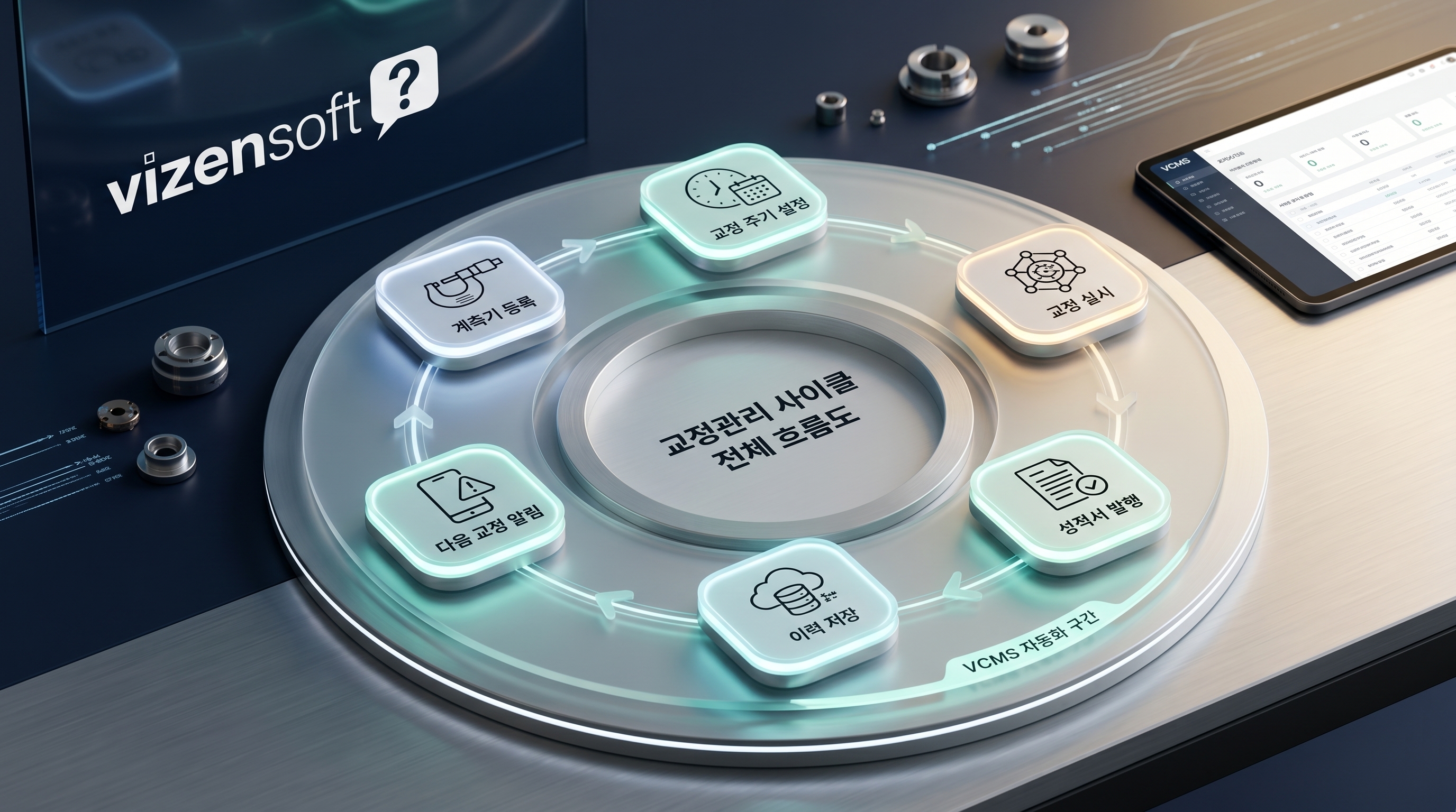 비젠소프트 VCMS는 교정 주기 자동 추적, 성적서 자동 생성, 통합 이력 관리, 실시간 현황 대시보드를 통해 교정 업무의 모든 병목점을 해소합니다. 담당자는 더 이상 교정 날짜를 외우거나, 서류를 뒤지거나, 야근하며 성적서를 만들 필요가 없습니다. 시스템이 먼저 알려주고, 자동으로 만들어주며, 언제든 꺼내 볼 수 있게 저장해 둡니다.
