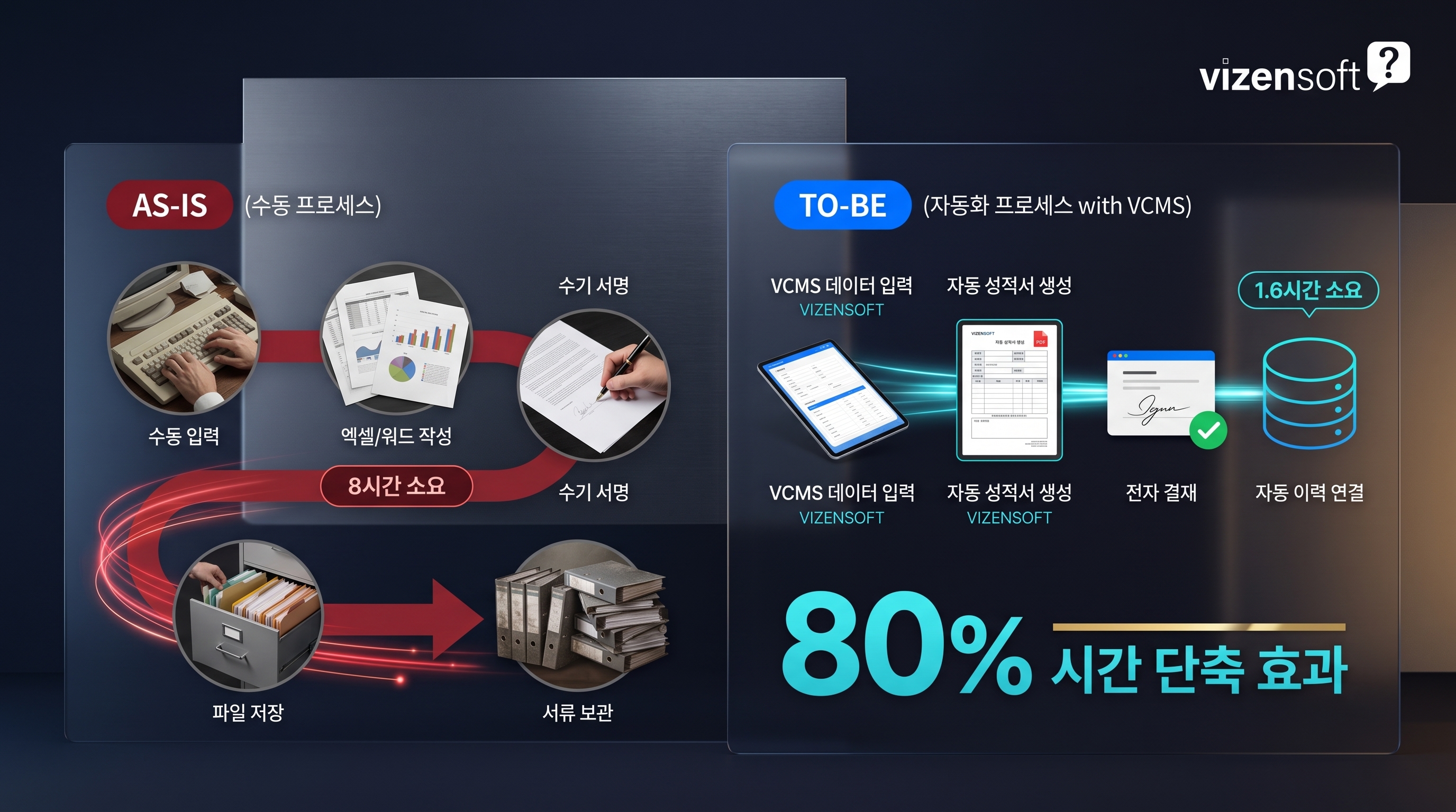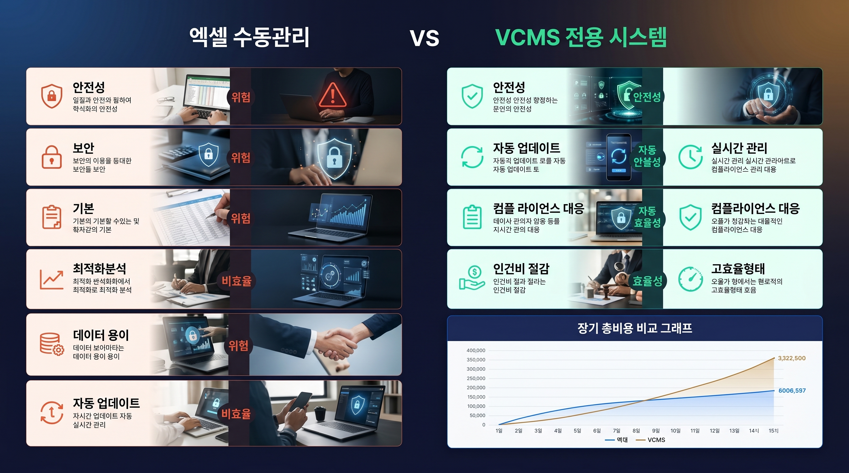 | 비교 항목 | 엑셀 수동관리 | VCMS 전용 시스템 |