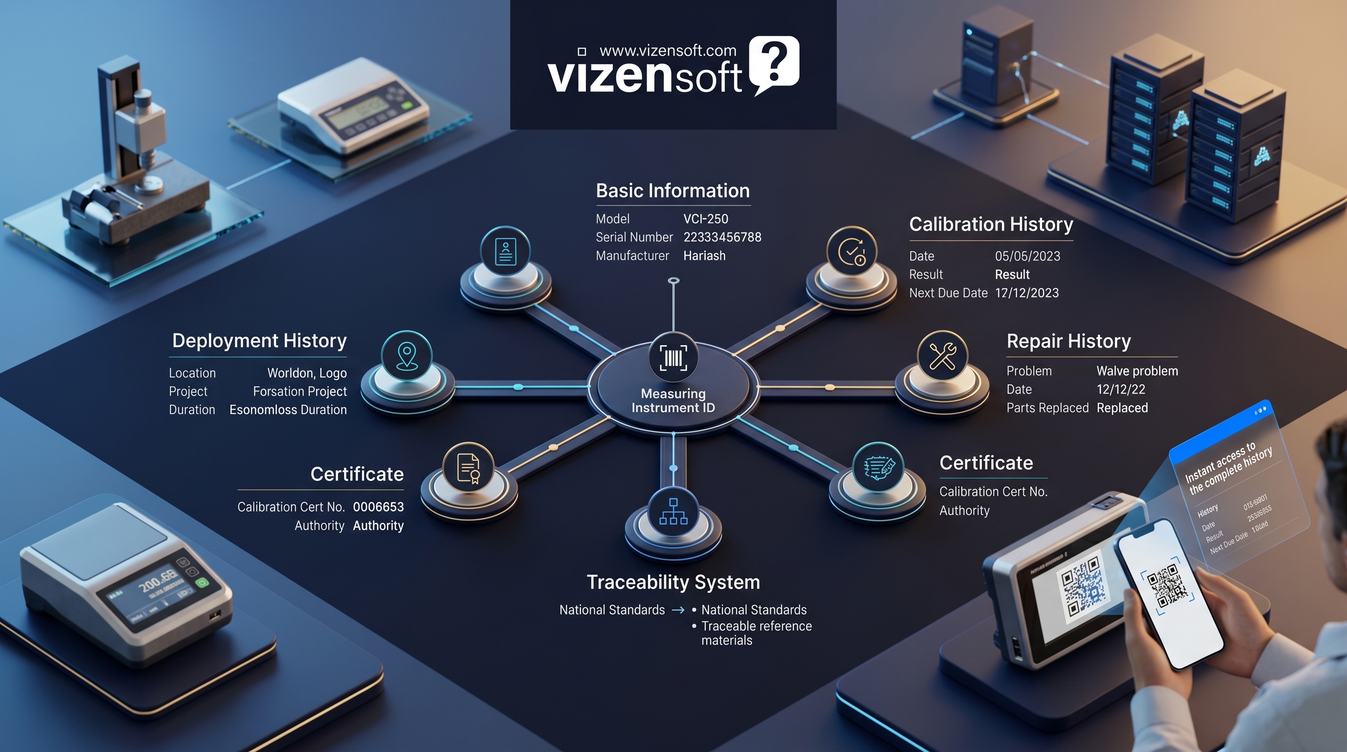 VCMS의 계측기 통합 이력 관리 기능은 개별 계측기를 단위로 모든 정보를 집약합니다. 각 계측기에는 고유 ID가 부여되며, 이 ID를 중심으로 다음의 모든 정보가 연결됩니다.