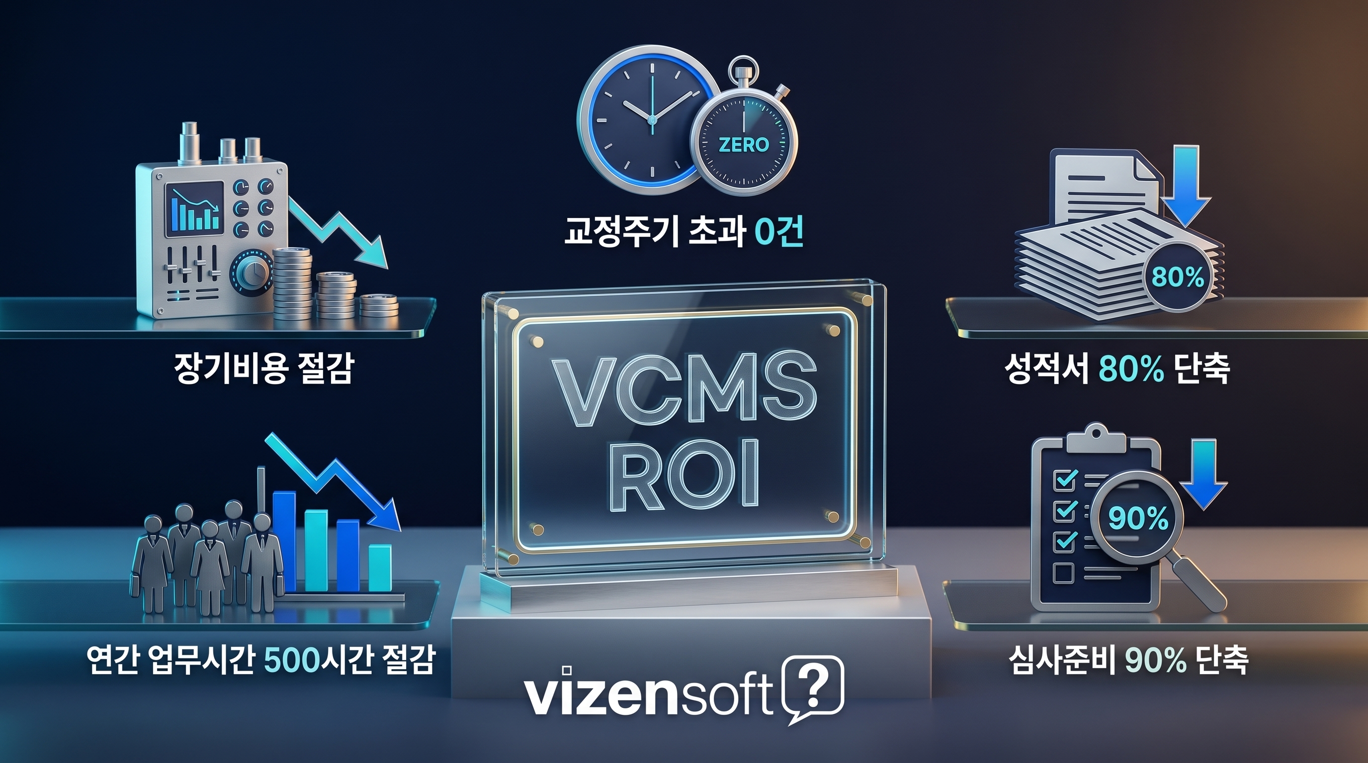 VCMS 도입의 경제적 효과를 수치로 정리해 보겠습니다. 계측기 300대를 운영하는 중견 제조업체 기준입니다.