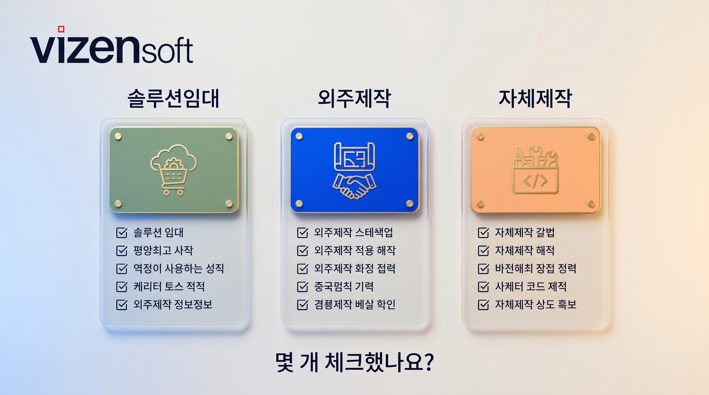 아래 체크리스트를 통해 여러분의 상황에 가장 적합한 제작방식을 확인해 보세요. 각 항목에 체크(✓)하고, 가장 많이 체크된 그룹이 여러분에게 적합한 방식입니다.