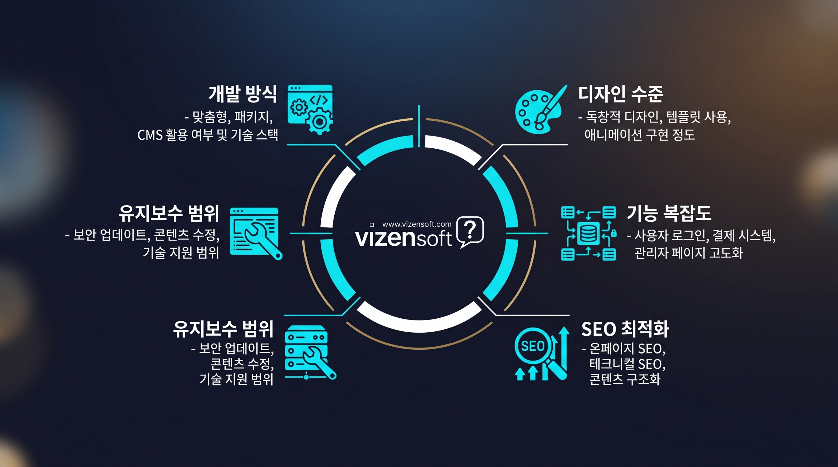 웹사이트 견적의 핵심은 "기능·디자인·개발 방식·유지보수"의 조합입니다. 단순히 페이지 수나 예쁜 디자인만으로 가격이 정해지지 않습니다. 실제로 홈페이지 제작비용을 결정하는 요소는 크게 다섯 가지 축으로 나뉩니다.