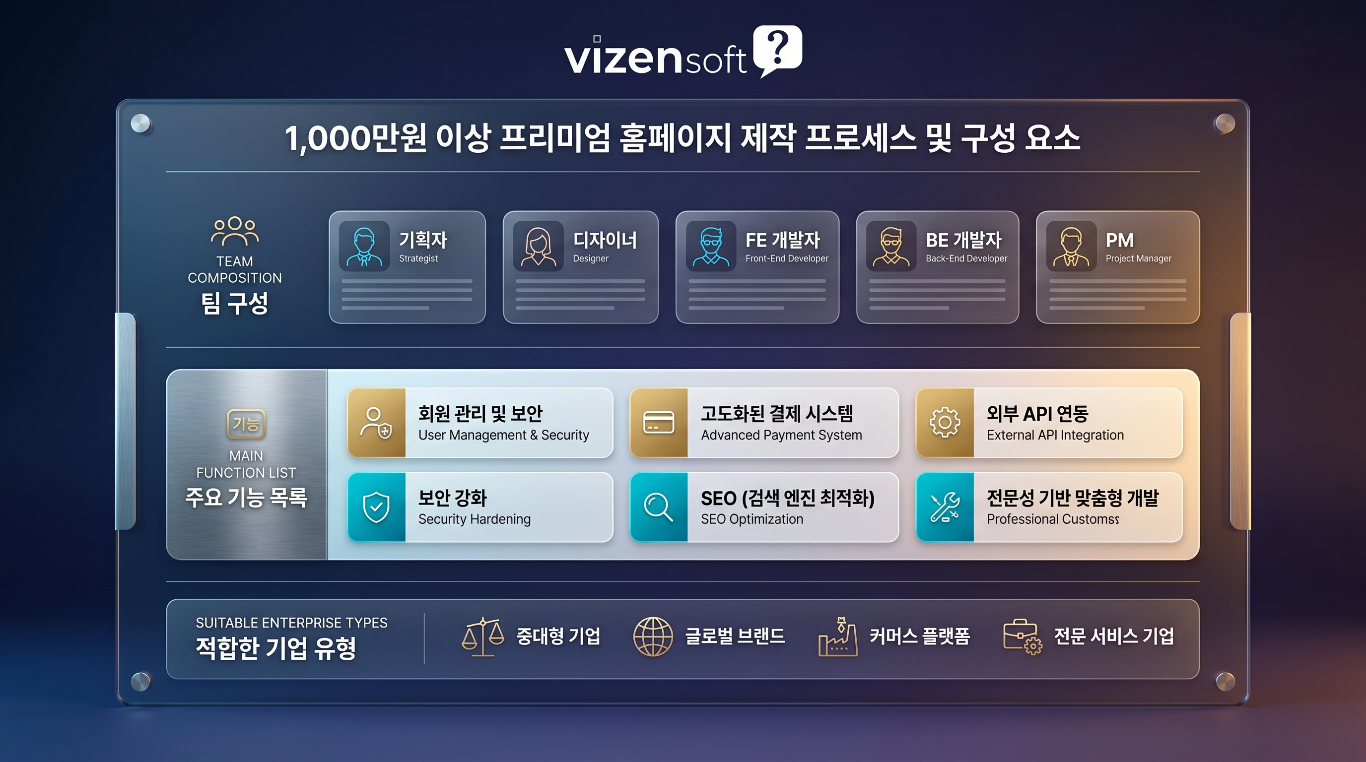 1,000만원 이상의 홈페이지는 "비즈니스 인프라형 플랫폼" 입니다. 더 이상 단순한 홈페이지가 아니라, 기업의 디지털 비즈니스를 가동시키는 핵심 시스템으로 기능합니다. 이 가격대에서는 개발자 한두 명이 단기간에 뚝딱 만들어내는 방식이 아니라, 기획자·디자이너·프론트엔드 개발자·백엔드 개발자·PM(프로젝트 매니저)으로 이루어진 전문 팀이 체계적인 프로세스로 구축합니다.